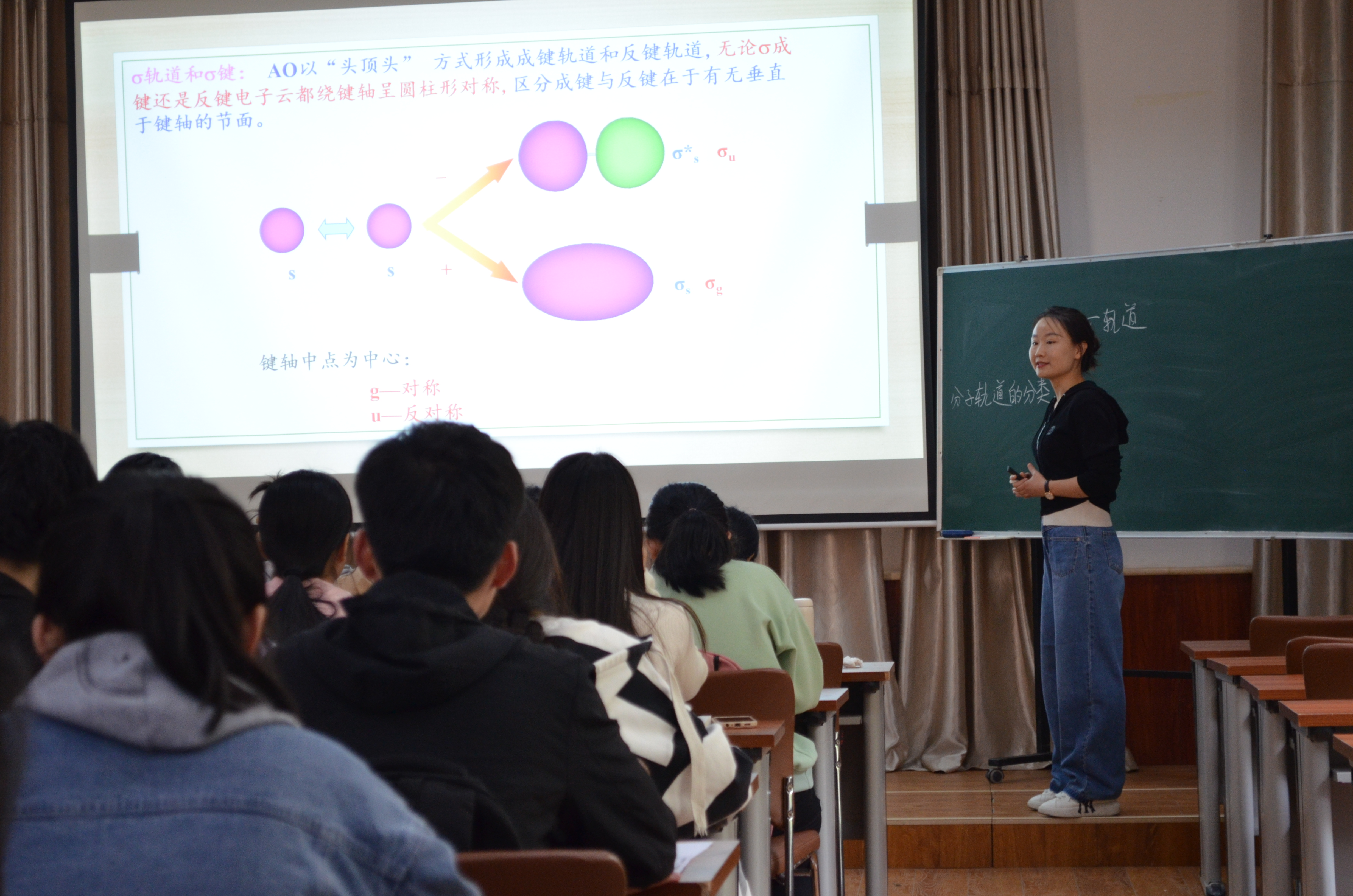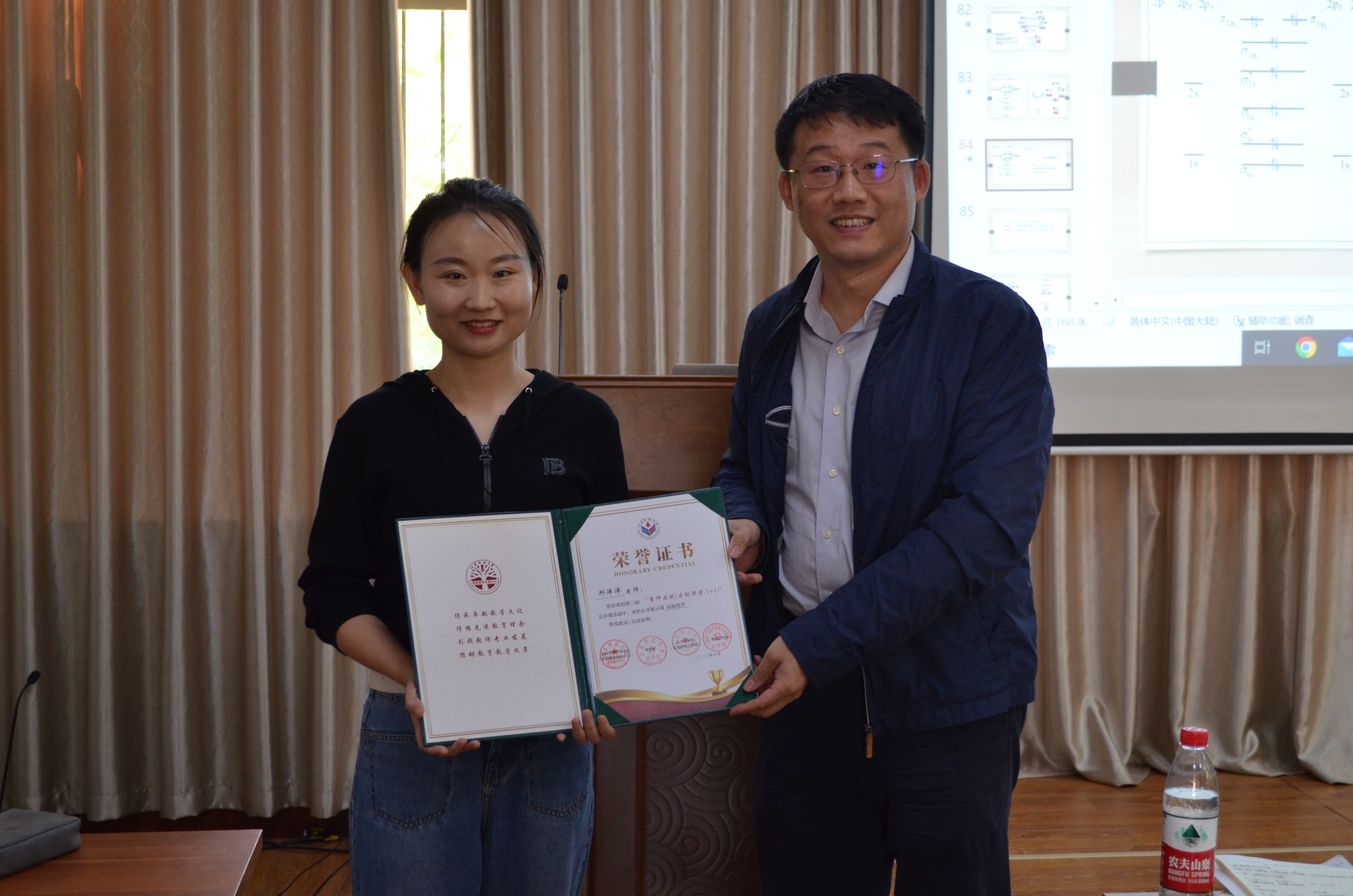 邢洋洋老师主讲专业必修课《结构化学》。公开课上,邢洋洋老师首先引导学生回忆学过的知识点,后用树状图由略到详,循序递进的讲明σ键和π键等知识点。在讲述过程中结合图像动画,使学生深入理解课本的概念和反应过程。同时邢洋洋通过课堂师生互动的形式使学生积极参与教学活动,并在课堂中给予一定的时间让学生自主思考问题。马慧超老师主讲专业必修课《无机化学》。马慧超老师用思维导图指出各符号之间存在的关系,接着从学习目标、概念、原理、影响因素及可能存在的问题一一做出详细解释,为学生提供清晰全面的教学指导。同时,马慧超老师运用具体数据和视频讲解仪器与其运作。