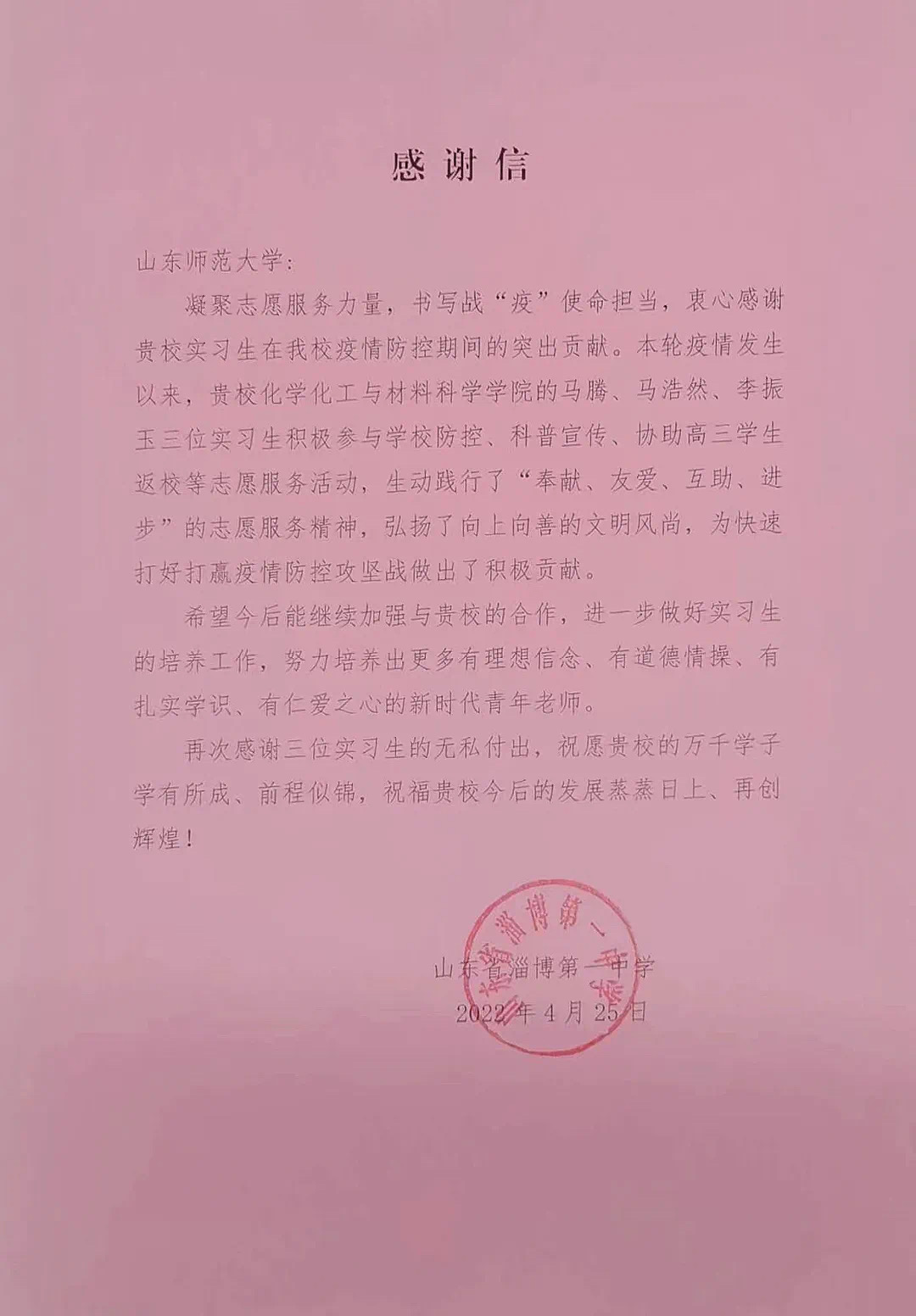近日,山东省淄博第一中学向学校发来感谢信,对我院2019级化学三班马腾,化学二班马浩然、李振玉三名同学实习期间在疫情防控、志愿服务工作中的突出贡献表示感谢。《感谢信》全文如下:
