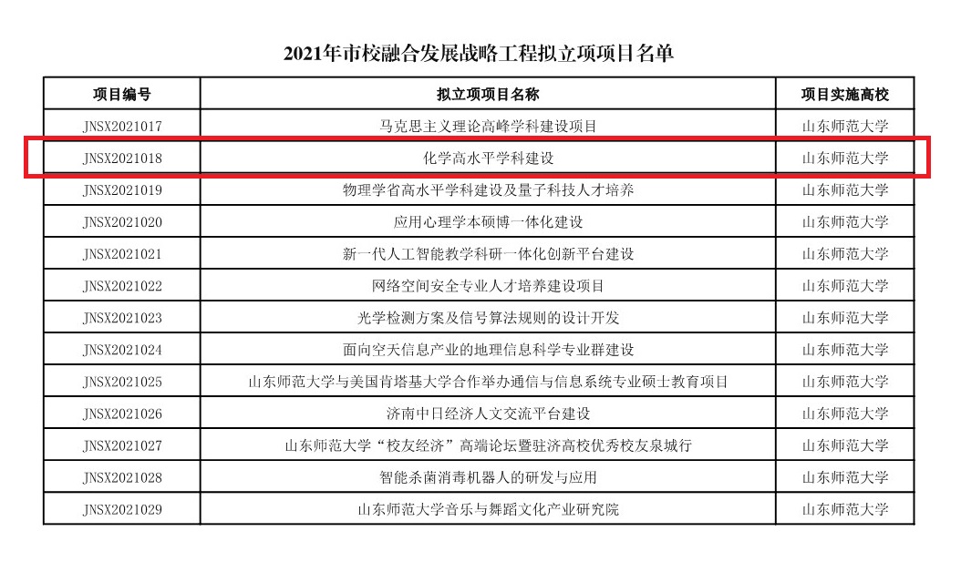 近日,济南市教育局公布了2021年市校融合发展战略工程项目立项资助结果,我院“化学高水平英国365”项目获批立项资助。
