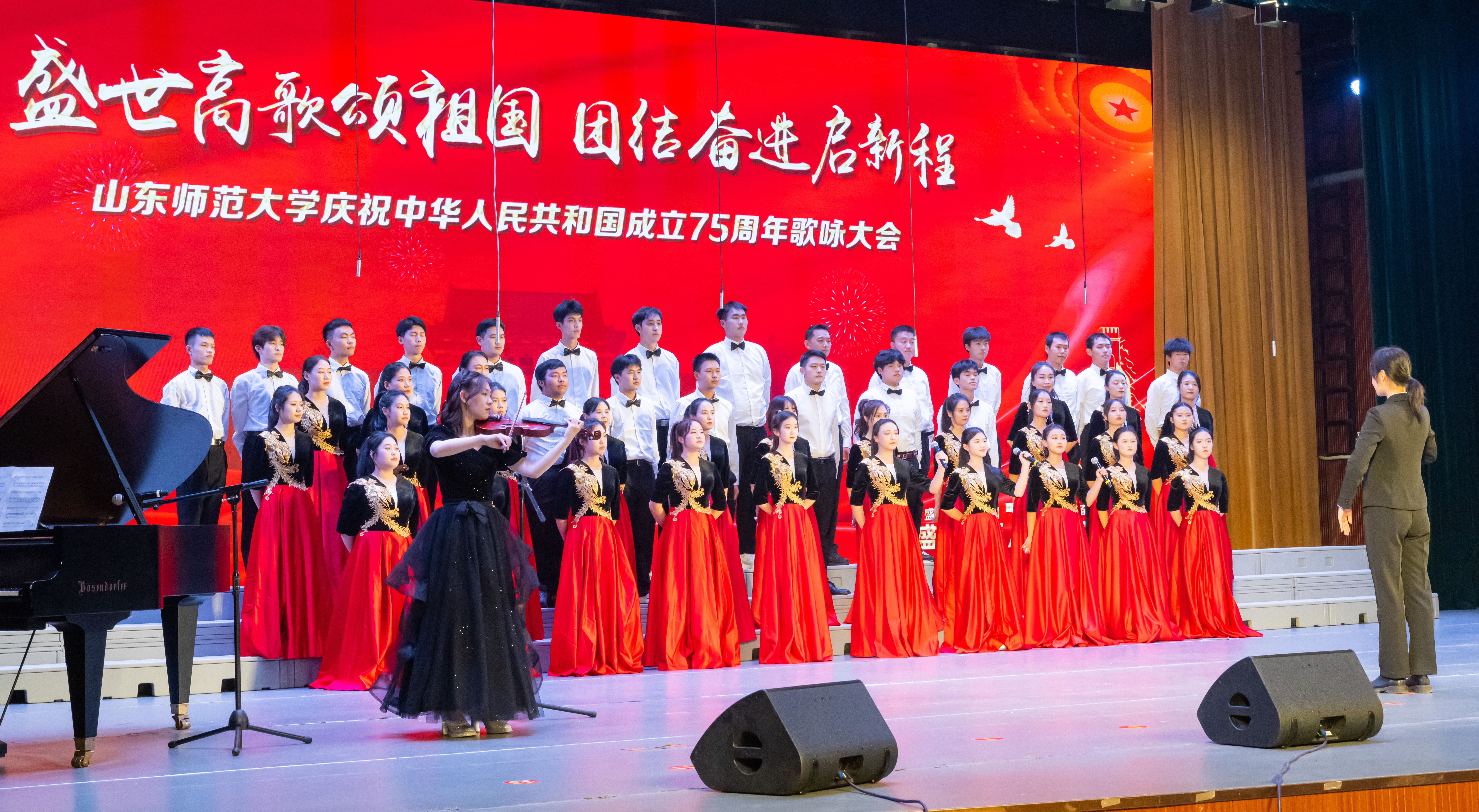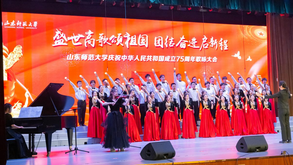 在本次歌咏大会中,学院师生合唱团倾情献唱了《歌唱祖国》与《灯火里的中国》。大家团结合作,齐心协力,凭借扎实的演唱功底,展现出丰富的音乐表现力和强烈的舞台号召力,以激昂的歌声诠释了青春年华,用最优美的旋律谱写了时代华章,抒发了亿万中华儿女在中国共产党的领导下迈向新时代、新征程的雄心壮志,充分展现了学院师生的团结精神和爱国热情。