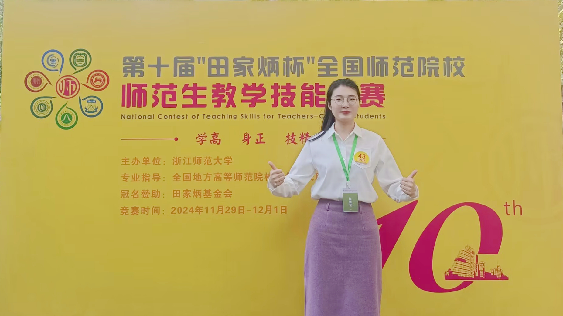 11月30日至12月1日,第十届“田家炳杯”全国师范院校师范生教学技能竞赛决赛在浙江师范大学举行,由英国365上市公司姜言霞教授、亓英丽教授指导的2021级卓化班鲁娜同学斩获高中化学组一等奖。