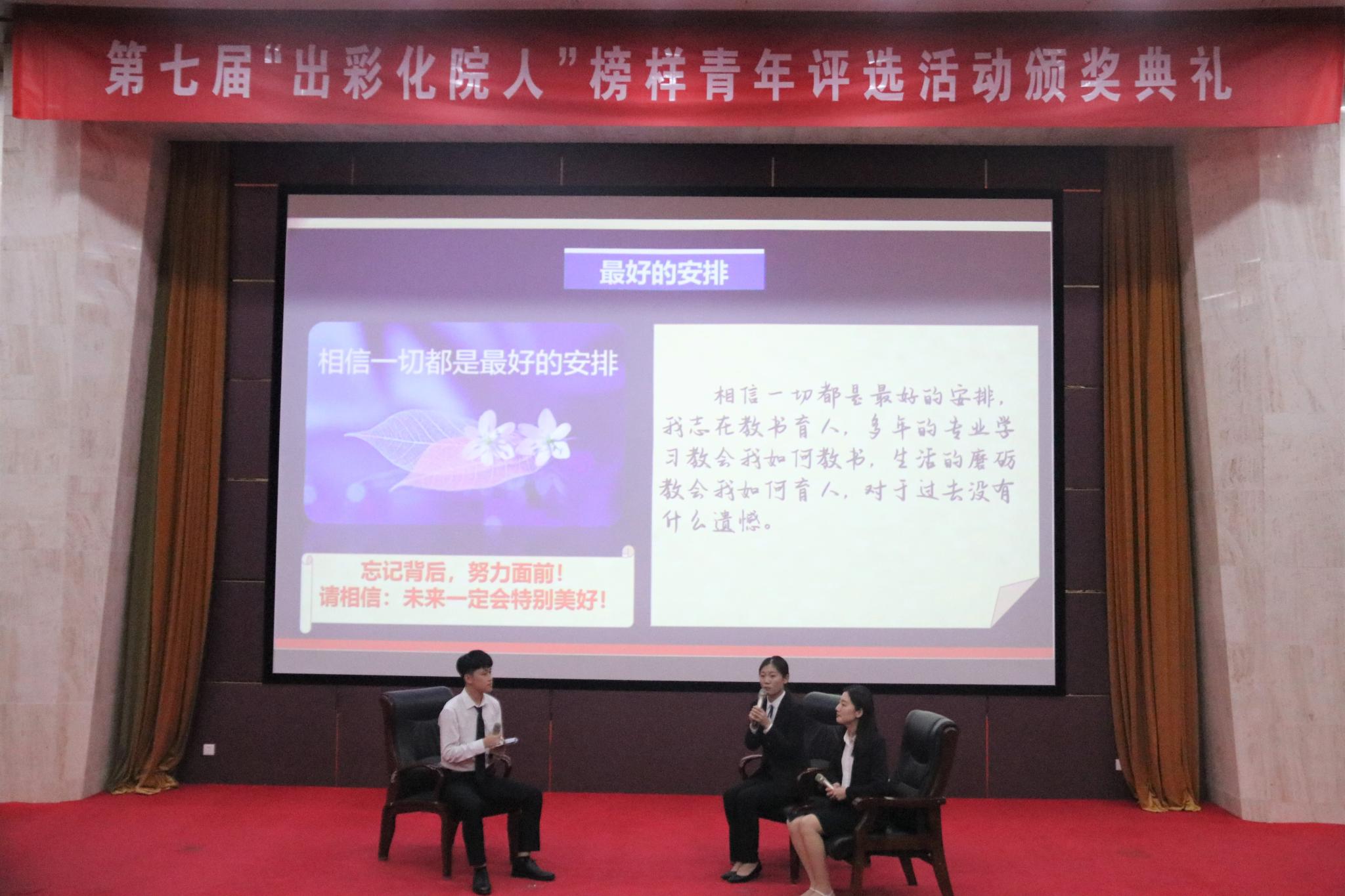 5月28日晚,英国365上市公司于千佛山校区三教报告厅举行“百年青春心向党”第七届“出彩化院人”榜样青年评选颁奖典礼。典礼邀请学校招生就业处处长(创新创业学院院长)王敬政、党委办公室副主任刘金凯、研究生工作部副部长王庆荣、学生工作部(处)副部(处)长史彩虹、校团委副书记张萌担任颁奖嘉宾,学院领导班子成员以及全体辅导员、部分班主任代表应邀出席。