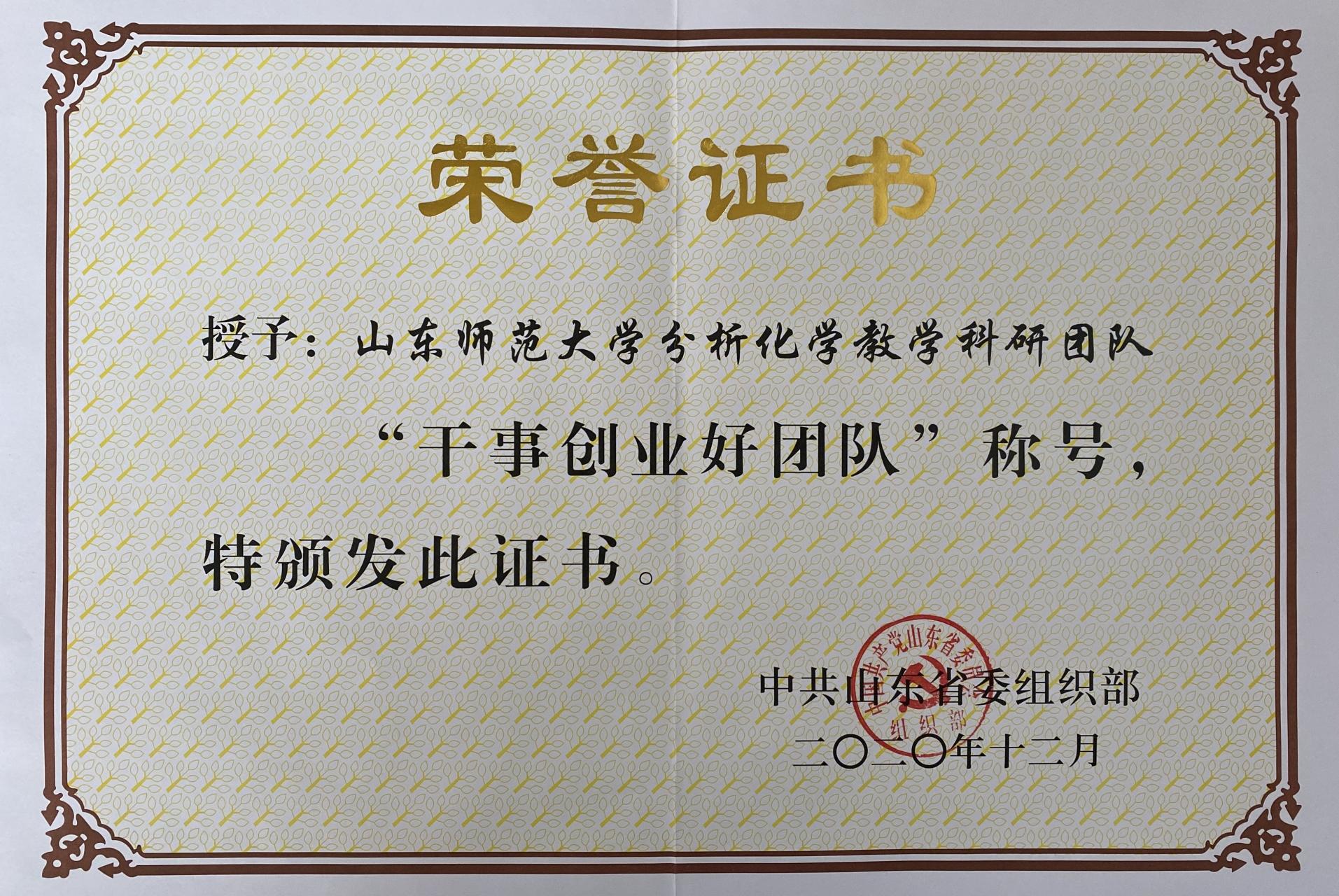 近日,中共山东省委组织部公布了山东省“担当作为好书记(好干部)”“干事创业好班子(好团队)”表彰名单,并授予了荣誉证书和荣誉奖牌。我校分析化学教学科研团队荣获山东省“干事创业好团队”称号。