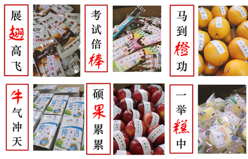 每个加油礼包内含具有美好寓意的食品,牛奶寓意“牛气冲天”、苹果寓意“硕果累累”、橙子寓意“马到成功”、鸡翅寓意“展翅高飞”、棒棒糖寓意“考试倍棒”、蛋糕寓意“一举高中”。其中,牛奶、苹果和橙子以及棒棒糖的口味在每个礼包内随机发放,增添礼包开封的惊喜感。除此之外,礼包准备过程中还有多种途径提升随机性:在包装盒的选择上分为白色和牛皮色两种,盒子外贴的两面祝福贴纸及内置明信片更是准备了多种样式,力求每位考生收到独一无二的惊喜!此外,为加强考生打开包装的仪式感,在每一个装包完成的加油礼包外侧还贴有印刷“开封有好运”字样的封条,整个准备过程心意满满。