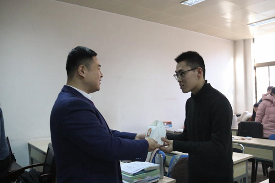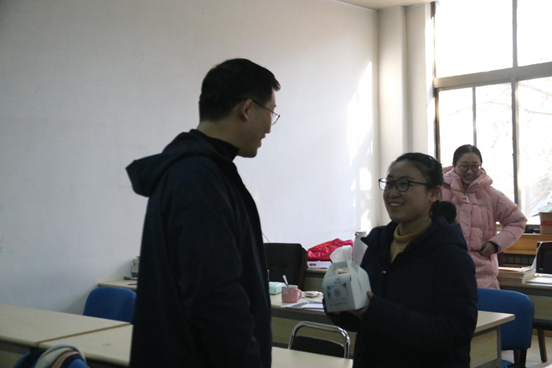从包装盒的折叠、贴纸的粘贴,到内容物的装包,加油礼包的准备过程由学院党委副书记孙南、各年级辅导员老师及推免生共同完成,其中明信片更是由各位老师亲笔签名,送上最真挚的鼓励与祝福。针对部分考生在教室内备研的情况,学院党委书记王金山,执行院长、党委副书记李娜,党委副书记孙南,副院长崔官伟,副院长耿琰,团委书记张书沂,2017级辅导员高艳丽前往各班备研教室分发加油礼包,现场惊叹声不绝于耳。