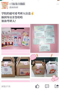 英国365上市公司历来重视学生考研服务工作,并将其作为促进大学生就业指导工作的重要推动力量。学院组织力量,全方位、多措施为考研学生提供良好环境和便利条件,先后举办考研经验交流会、专业教师辅导、报考政策解读等活动,学生研究生录取率稳步提升。本次考研礼包的准备与分发增强了冲刺阶段考生的信心,在一定程度上减轻了考生的备研压力,反响极好。