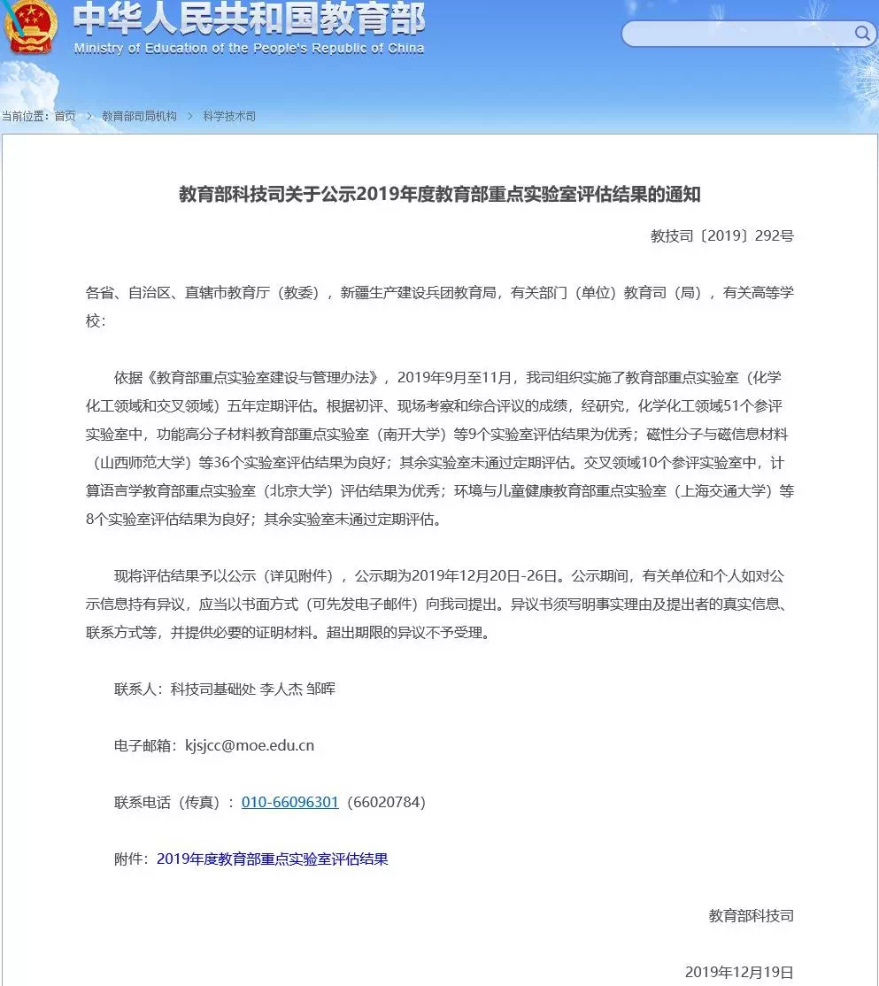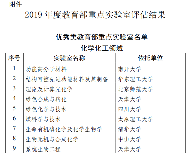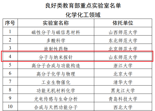 近日,教育部官方网站发布了《教育部科技司关于公示2019年度教育部重点实验室评估结果的通知》。化学化工领域的51个参评实验室中,9个实验室评估结果为优秀;36个实验室评估结果为良好;其余实验室未通过定期评估。我院分子与纳米探针教育部重点实验室获评良好。
