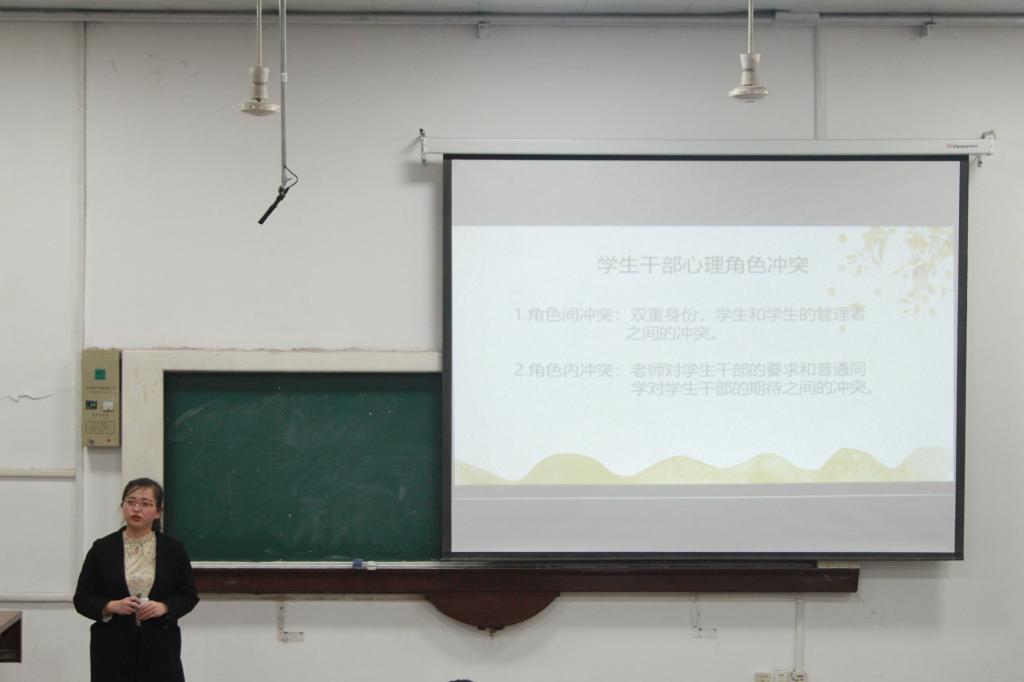 紧接着,周民凤聚焦学生干部心理困扰和疏导问题,从正反两方面合理的论证了认识自己的重要性,并为同学们提供了几种排解压力的途径。