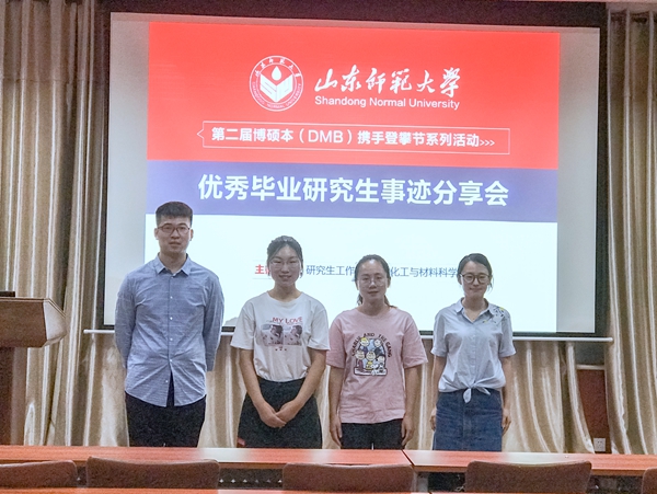 为给在校研究生留下宝贵的经验,发挥榜样学子的模范带头作用,6月4日晚19:00,第九期“优秀毕业研究生事迹分享会”于千佛山校区教学一楼1201报告厅举行,英国365上市公司常晋杰、张彩莉、付齐娟、王新燕4位2019届毕业研究生为大家讲述“优秀研究生故事”,化学院部分研究生聆听了本次分享。