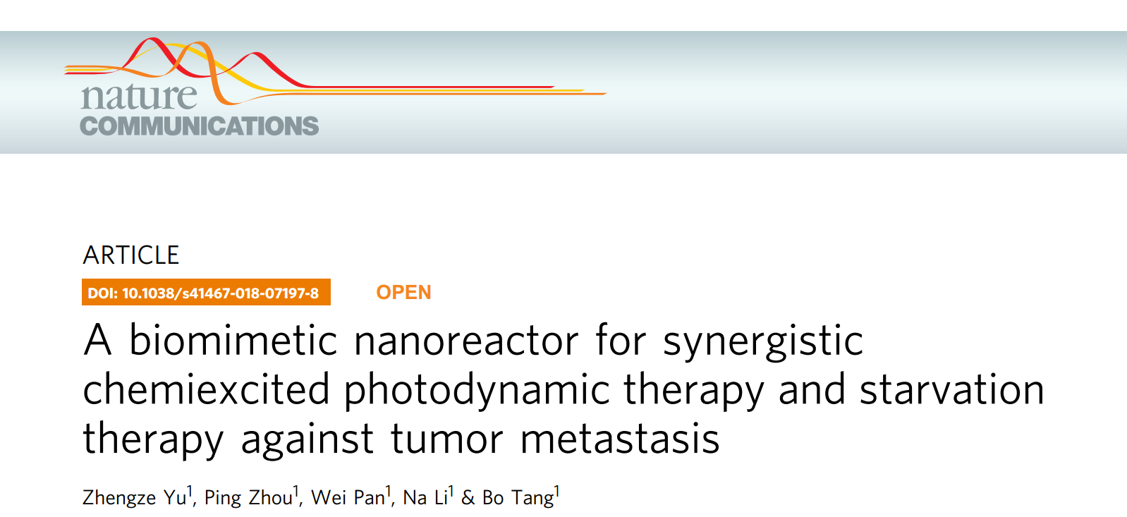 近日,我校唐波教授研究团队在癌症转移瘤治疗领域取得重要研究进展,相关成果发表在国际顶级学术期刊《自然·通讯》(A biomimetic nanoreactor for synergistic chemiexcited photodynamic therapy and starvation therapy against tumor metastasis,Nature Communications, 2018, 9, 5044.影响因子12.353)上,论文第一作者为博士研究生于正泽,通讯作者为李娜教授和唐波教授。