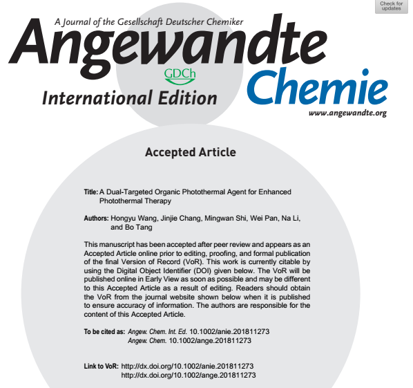 近日,我校唐波教授研究团队在光热靶向治疗领域取得重要研究进展,相关成果发表在国际顶级学术期刊《德国应用化学》(A Dual‐Targeted Organic Photothermal Agent for Enhanced Photothermal Therapy,Angew. Chem. Int. Ed.,DOI:10.1002/anie.201811273,影响因子12.102)上,论文共同第一作者为青年教师王洪玉和硕士研究生常晋杰,通讯作者为李娜教授和唐波教授。