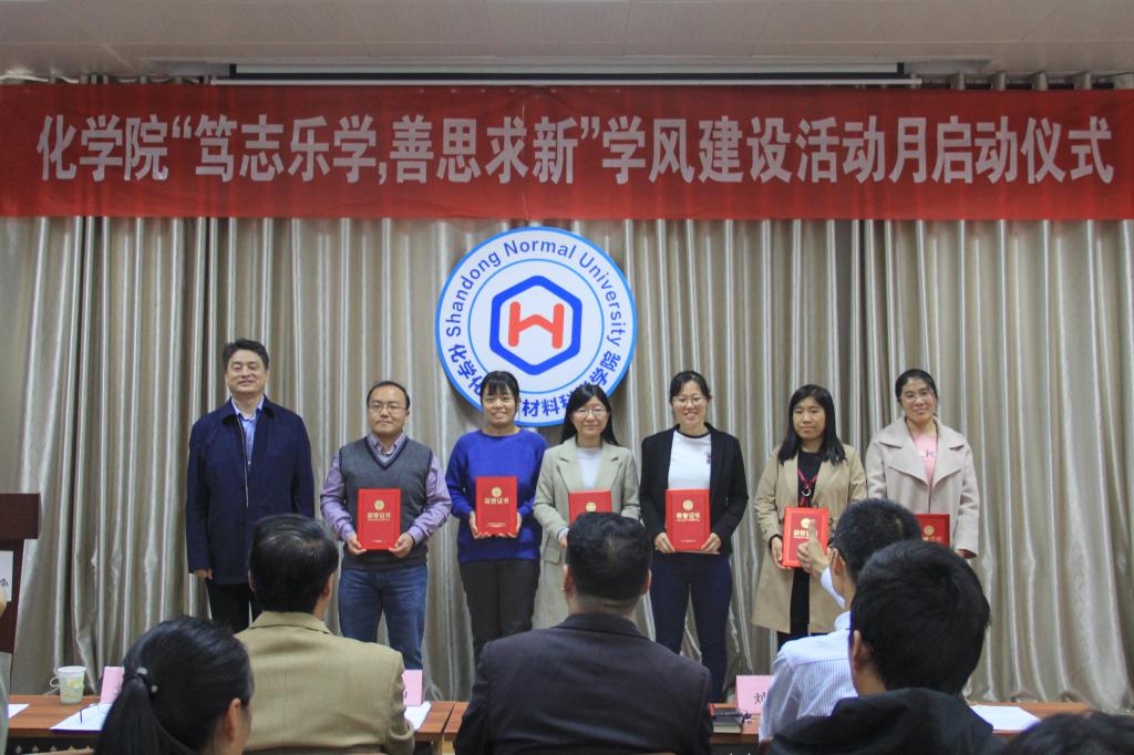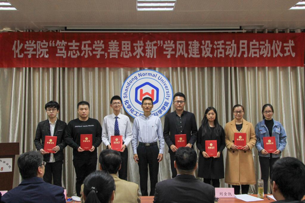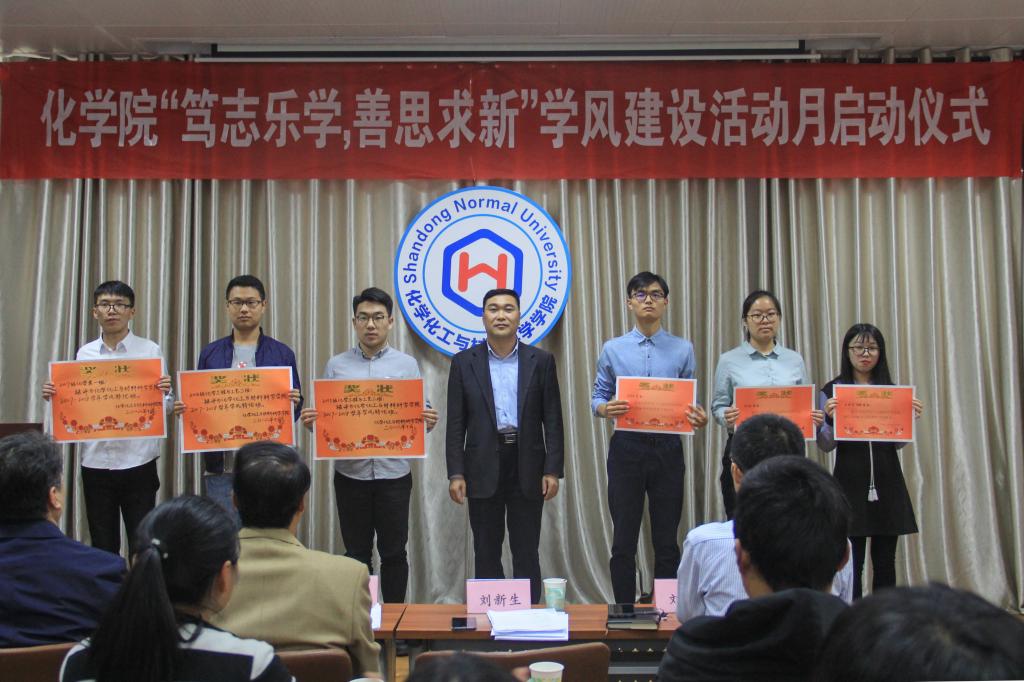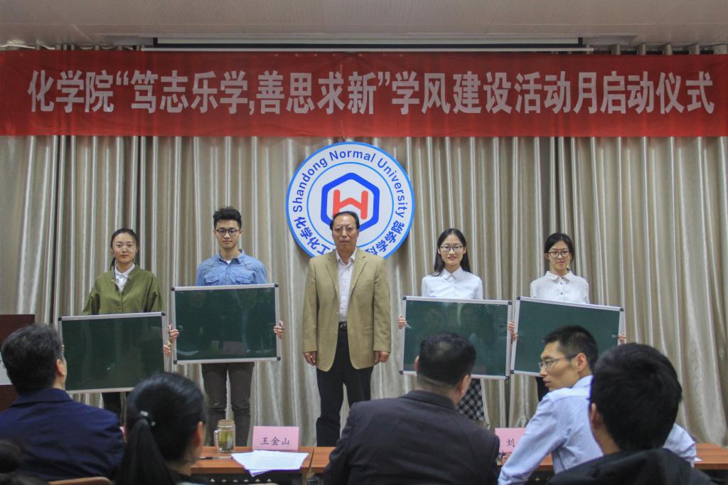 会议伊始,刘金凯宣读了开展学风建设活动月的通知,部署了学风特优班和学习型宿舍创建、教授接待日、师范生教师技能提升工程等学风建设活动,号召全院学生签署学风建设倡议书。随后,刘浩、刘新生、陈蓁蓁分别宣读了2018年化学院实习工作、优秀教学能手、优秀班主任、学风特优班和优秀学习型宿舍的表彰决定并颁发证书。为进一步加强师范生教学基本功训练,学院为各年级每个师范生宿舍配备小黑板和粉笔,王金山为宿舍代表发放了用品。然后,院学生会主席宣读学风建设倡议书,号召同学们把学风建设落实到日常学习生活中。教育实习指导教师代表郭佃顺教授结合自身指导实习经历,重点强调了责任心、爱心和奉献精神在工作中的重要性。国家奖学金获得者肖铭慧讲述了个人奋斗经历。最后,王金山总结了会议内容,重申了学风建设的必要性。他表示,学风建设不仅需要学院高度重视,狠抓落实,还需要学生积极融入,长期坚持,通过全院师生共同努力,实现把学风建设引入制度化、规范化轨道的目标。同时,他给予化院学子高度期望并鼓励青年学生努力学习,为个人的发展打下扎实基础,为学院的发展贡献自己的力量。