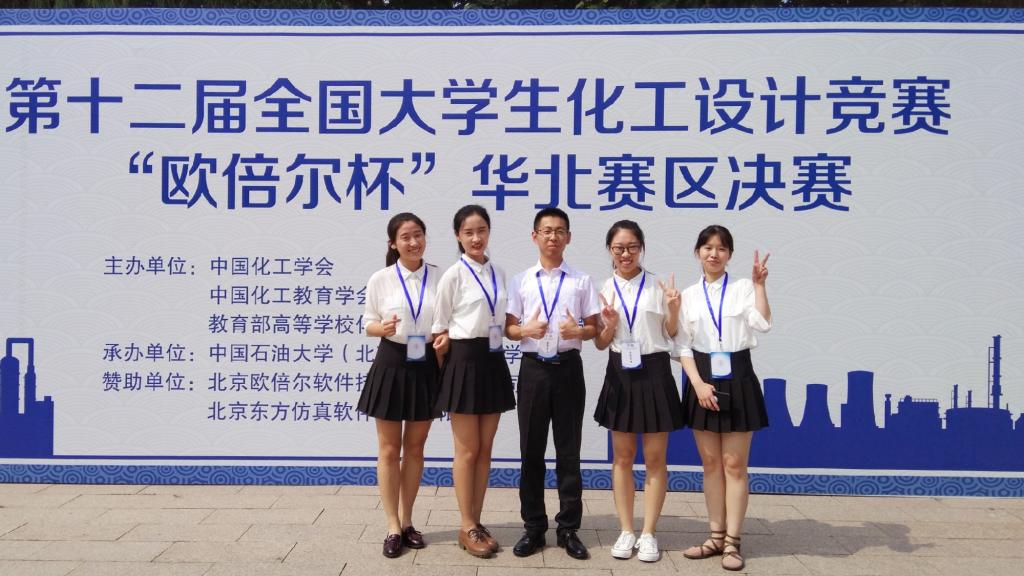该竞赛由中国化工学会、中国化工教育协会、教育部高等学校化工类专业教学指导委员会主办,中国石油大学(北京)化学工程学院承办,今年华北赛区共有来自57所高校的198支队伍参加,60支队伍进入华北赛区决赛阶段,其中包括清华大学、天津大学、北京化工大学、中国海洋大学、中国石油大学、中国矿业大学等著名高校。由我院蒋志强、孙华宇、王俪璇、张聍心、李珊珊五名同学组成的“无畏”队经过4个月的精心准备,取得了华北赛区的决赛资格。决赛分为现场作品展示和作品评审两大部分,各队伍在进行现场作品展示的同时,专家组进行作品评审。专家组作品评审分综合审查、现代设计方法、工程图纸、设计文档四个专项进行审核;现场作品展示需要参赛选手借助PPT对设计成果进行15分钟的说明与汇报,并进行10分钟的答辩,由评委老师和企业高级工程师就设计方案等内容进行提问,由参赛选手现场作答。在紧张的比赛过程中,我院“无畏”队五名同学团结一心、全力以赴,凭借《10万吨/年二步法制备甲基丙烯酸甲酯项目》设计作品赢得了评委们的一致认可,获得了华北赛区一等奖。