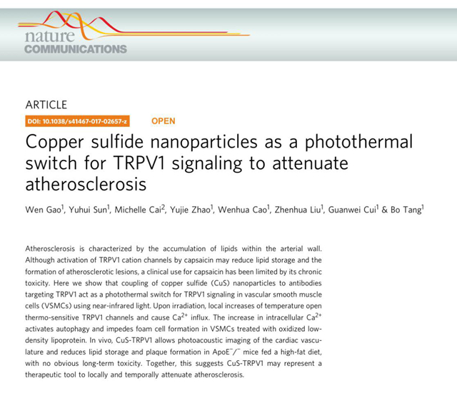 动脉粥样硬化引发的急性心脑血管疾病已经成为危害人类健康的“第一杀手”。早期干预动脉粥样硬化的进程可以有效降低心脑血管疾病的发病率和死亡率。针对目前临床使用的雷帕霉素、辣椒素等药物特异性差、不可调控、毒副作用大、疗效低的问题,唐波教授研究团队通过组装能够控制温敏离子通道TRPV1的纳米光热开关,实现了血管平滑肌细胞内TRPV1-自噬信号通路的精准激活,从而有效阻止泡沫细胞的堆积和动脉粥样硬化斑块的形成,极大提高了动脉粥样硬化治疗的精准性、有效性和安全性,具有重要的临床研究价值。