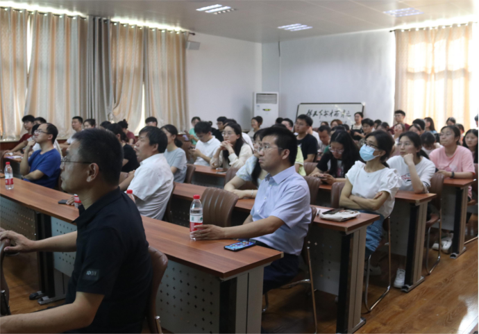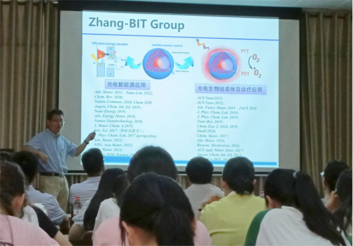 报告伊始,张加涛教授对本次报告的研究背景进行了介绍,讲解了光能高效捕获与转换利用的重要性以及半导体纳米结构的广泛应用,同时指出大晶格失配下,半导体纳米结构的外延合成存在瓶颈。基于此,张加涛向与会师生介绍了用于合成半导体纳米异质结构的逆向阳离子交换(RCE)法,该方法是由配位活性引起的逆向阳离子交换,实现阳离子与半导体胶体纳米晶及异质结构之间的离子交换反应。接着,张加涛讲解了原子级半导体的异质结构,提出利用逆向阳离子交换方法,实现半导体量子点中的深度位置异价掺杂。进而,张加涛教授介绍了原子/纳米异质界面的协同调控,并对金属@半导体异质纳米结构的合成与应用进行讲解。最后,张加涛教授对本次报告的内容进行总结,展现了半导体异质纳米结构合成化学广泛的应用前景。本次学术讲座的顺利召开,为我院师生搭建起科研与学术前沿交流的平台,能够有效拓宽自己的视野,助力学院师生的科研水平和学术能力实现新跨越,再上新台阶。