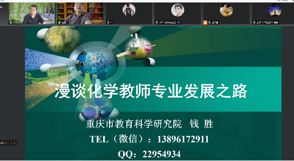 为深化人才培养改革,推进教师教育高质量发展,由我院主办的《名师进校园》系列讲座第三讲于5月12日晚举行。本期讲座采用线上和线下结合的方式,由教育部“国培计划”专家、重庆市化学教研员、正高级教师钱胜老师线上作《漫谈化学教师专业发展之路》的报告。报告由毕华林教授主持,参加报告的人员包括我院化学教学论教研室全体教师、研究生和部分师范生,还包括安徽师范大学、曲阜师范大学、青岛大学、鲁东大学等高校化学教学论教师、研究生、本科生等100余人。