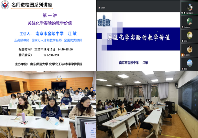 为全面贯彻党的教育方针,培养新时代“四有”好老师,由我院主办的《名师进校园》系列讲座第一讲于11月12日下午举行。本期讲座采用线上线下相结合的方式,国家万人计划教学名师、南京市金陵中学江敏老师线上作了《关注化学实验的教学价值》报告。我院化学教学论教研室亓英丽老师、卢姗姗老师带领全体教育硕士研究生在1107智慧教室,姜言霞老师带领2020级卓越教师班本科生在1244智慧教室现场收听。报告由毕华林教授主持,参加报告的线上人员还包括我院本科生、研究生,山东师大附中化学教师,曲阜师范大学、青岛大学、鲁东大学等高校化学教学论教师、研究生、本科生等200余人。