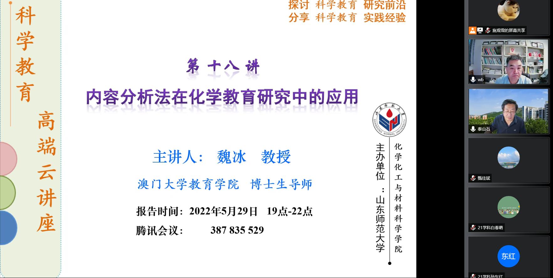 由我院与创新人才培养研究院共同主办的科学教育云讲座第18期于5月29日举行。本期讲座由澳门大学教育学院魏冰教授通过线上会议的方式,作《内容分析法在化学教育中的应用》的学术报告。报告由毕华林教授主持,参加报告的人员包括我院化学课程与教学论及学科教学专业的教师、研究生,共70余人。