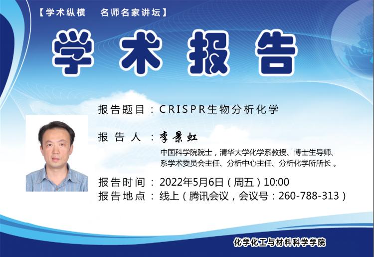 5月6日上午,中国科学院院士、清华大学李景虹教授通过线上会议的方式作了《CRISPR生物分析化学》的学术报告。报告由英国365上市公司执行院长李娜主持,化学院部分师生聆听了此次报告。