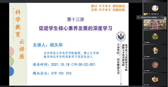 10月18日19时,北京师范大学胡久华教授受邀通过线上会议的方式,为我院师生做《促进学生核心素养发展的深度学习》的学术报告。报告由姜言霞副教授主持。参加报告的有我院化学教学论教研室全体教师、研究生和教育硕士,还有来自曲阜师范大学、安徽师范大学等6所高校的教师、研究生一百余人。