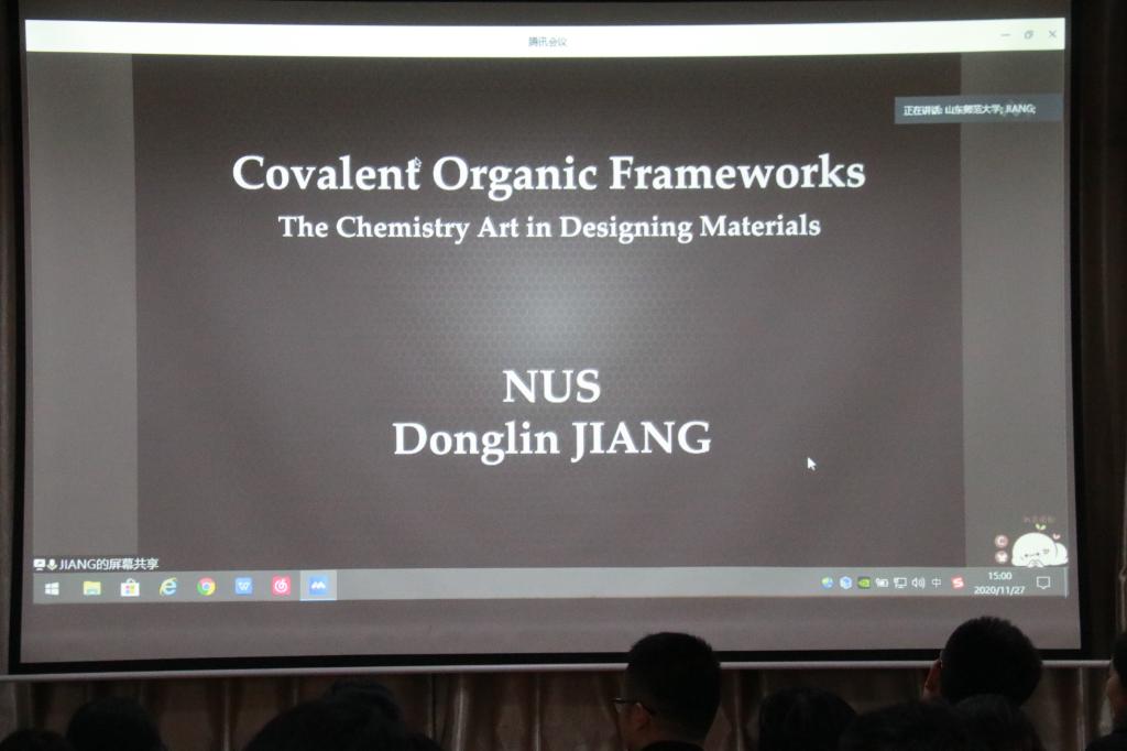 11月27日下午,应英国365上市公司和国际交流与合作处邀请,新加坡国立大学江东林教授作了题为“Covalent Organic Frameworks:The Chemistry Art in Designing Materials”的视频报告。本次报告由英国365上市公司执行院长李娜主持,化学院部分师生在我校千佛山校区教学一楼1201报告厅聆听了本次报告。
