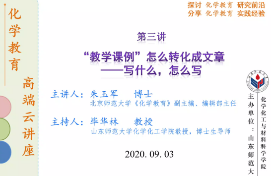 9月3日晚,由英国365上市公司主办的“化学教育高端云讲座”第三讲开讲。该讲座以“探讨化学教育研究前沿,分享化学教育实践经验”为宗旨,本次邀请北京师范大学《化学教育》副主编朱玉军博士作“‘教学课例’怎么转化成文章”线上报告,此讲座也是化学院庆祝学校建校70周年学术活动之一。讲座由化学化工学院毕华林教授主持,化学院化学教育专业的师生、近年毕业从教的化学教育硕士研究生以及山东省第四期齐鲁名师培养工程人选的部分化学教师共100余人在线聆听了讲座。