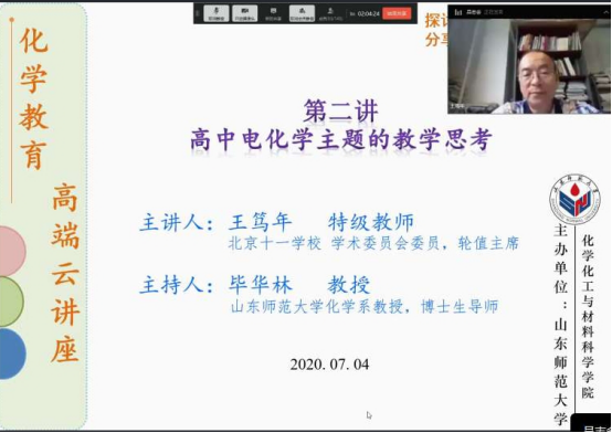 7月4日上午,由英国365上市公司主办的“化学教育高端云讲座”第二讲开讲。该讲座以“探讨化学教育研究前沿,分享化学教育实践经验”为宗旨,本次邀请北京十一学校特级化学教师王笃年做“高中电化学主题的教学思考”线上报告,此讲座也是化学院庆祝学校建校70周年学术活动之一。讲座由化学化工学院毕华林教授主持,化学院化学教育专业的师生、近年毕业从教的化学教育硕士研究生以及山东省第四期齐鲁名师培养工程人选的部分化学教师共100余人在线聆听了讲座。
