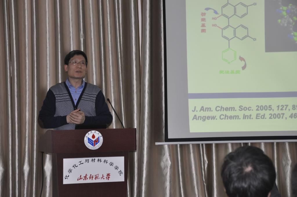 王金山书记首先欢迎吴教授来我校作学术报告,并简要的介绍了吴教授的科研工作经历和成果。报告中,吴教授主要介绍了自己多年来在金属有机框架结构材料(MOFs)作为荧光传感材料和仿生催化两方面开展的研究工作,并重点介绍了金属有机框架材料模拟生命体中各种酶在催化氧化、还原各类有机底物方面多年的研究成果与科研体会,报告内容丰富多彩。在互动环节,吴教授耐心回答了老师和同学们提出的问题。会后,老师和同学们纷纷表示获益匪浅,了解了“仿生框架材料的结构设计与催化性质”的研究价值和应用前景,开拓了研究思路。
