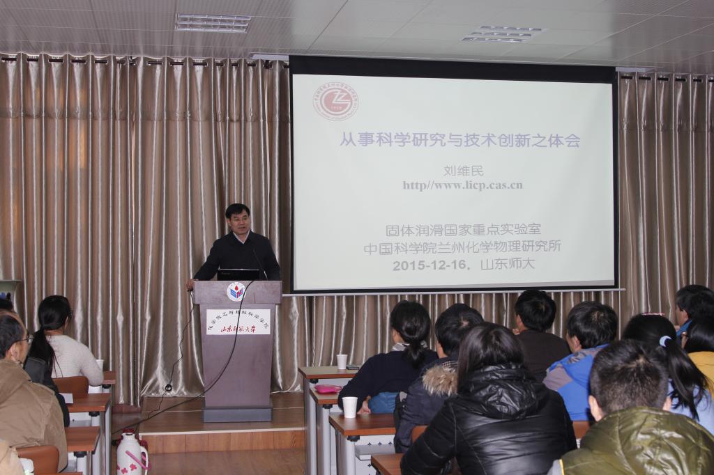 12月16日上午,中国科学院院士、我院80级校友刘维民教授在千佛山校区教学一楼1201教室作了《从事科学研究与技术创新之体会》的报告。报告会前,校长唐波在文化楼二层接待室亲切会见了刘维民院士,交流了学校的发展近况和英国365情况,科技处、我院负责同志参加了活动。报告会由唐波主持,我院部分师生聆听了报告。