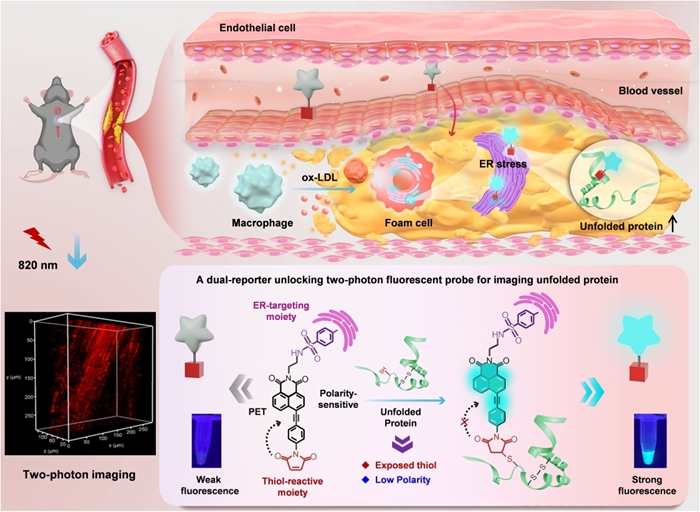 动脉粥样硬化作为一种慢性进展性疾病,其早期斑块形成机制复杂且临床检测困难。近年研究发现,以未折叠/错误折叠蛋白质积聚为特征的蛋白质稳态紊乱,是驱动动脉粥样硬化发生发展的关键分子事件。然而,由于未折叠蛋白缺乏明确的结构特征,传统化学探针难以实现对其直接、特异性成像,限制了对其在斑块形成中时空分布与功能机制的深入理解。因此,开发能够实时、高灵敏成像未折叠蛋白的分子工具,对揭示动脉粥样硬化早期病理机制及实现早期诊断具有重要意义。