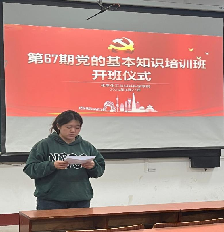 第六十六期党基班学员代表、第六十七期党基班班长潘亦同和第六十七期党基班学员代表史晓璇相继发言,表示将以身作则,牢记党的宗旨,不断加强理论学习,提高理论修养,增强服务意识和奉献精神,争取早日加入党组织。