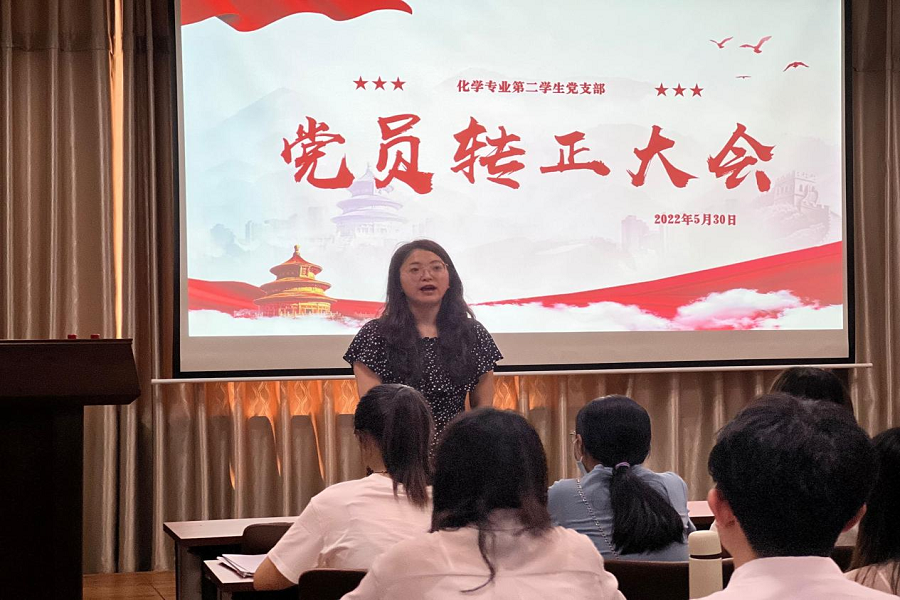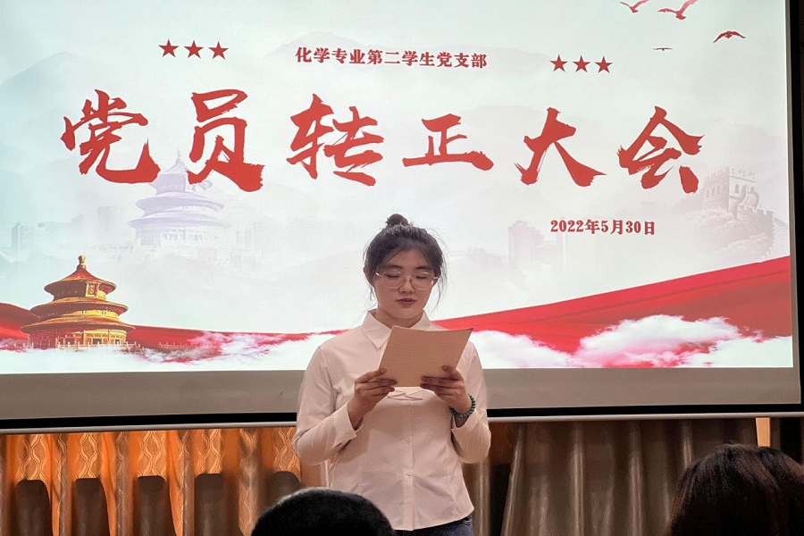 建团百年,青春向党,5月30日上午,英国365上市公司化学专业第二学生党支部于千佛山校区一号教学楼1201教室成功举办党员转正大会,讨论对李雨含等8名预备党员的转正工作。本次大会由化学专业第二学生党支部组织委员贾文雨主持,支部22名学生党员参会。