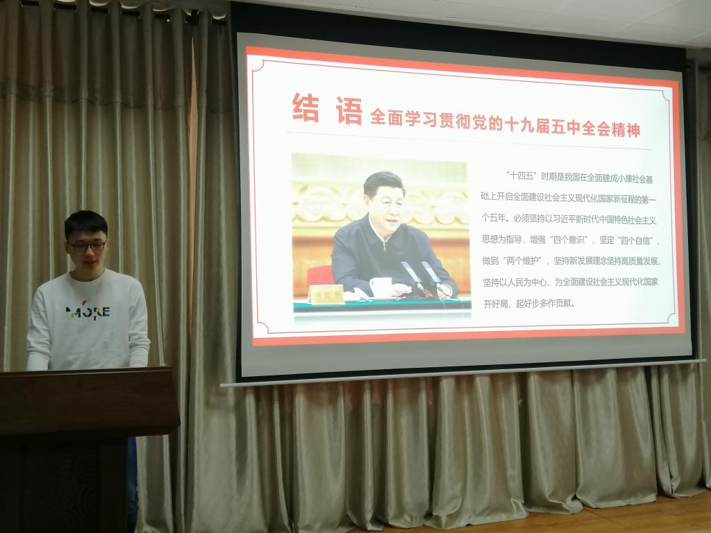 为响应国家推动兴起学习贯彻党的十九届五中全会精神浪潮,引导党员增强“四个意识”、坚定“四个自信”、做到“两个维护”,11月28日上午,化学院化学专业学生党支部于千佛山校区一号教学楼1201教室成功举办“党的十九届五中全会精神学习”主题党课。本次党课由化学专业学生党支部组织委员毕毓翔主讲,化学院全体党员及预备党员积极响应并参与其中。