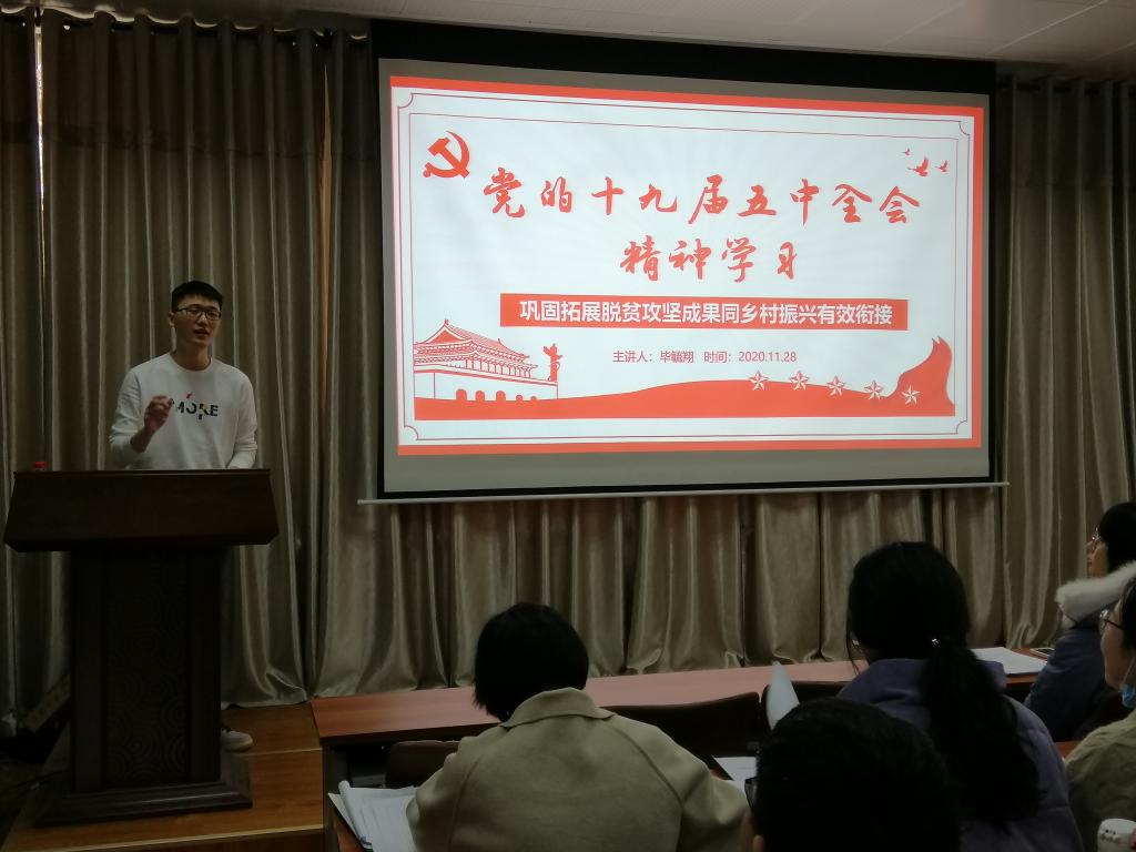党课伊始,毕毓翔首先介绍党的十九届五中全会流程,从整体上阐述党中央研究和制定国民经济和社会发展第十四个五年规划和二〇三五年远景目标和建议。紧接着,毕毓翔带领大家回顾脱贫攻坚优秀成果,结合实践中切实感到的脱贫成果,详细地阐述“中国开启了人类减贫历史上的伟大创举”的具体实施方案以及其中蕴含的中国特色社会主义理论体系原理。随后,他提出党员要加强化学学科基础知识的深学细研,强调推动脱贫攻坚与乡村振兴有效衔接的工作重心——产业振兴与化学专业之间的联系,期望党员以身作则,尽自己所学所能回报社会。最后,党员互相交流分享学习心得,在探讨中将党的十九届五中全会精神内化于心,用实际行动更好地助力建成社会主义现代化强国。