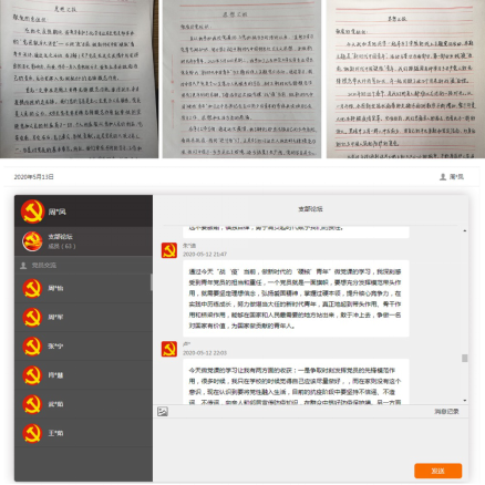 活动第二阶段,学生党员和入党积极分子围绕“五四青年节习近平总书记寄语新时代青年” 并结合自身体会进行交流。肖铭慧结合“五四青年节”抒发感慨,“在特殊时期,要思考作为学生党员身上承担的责任,我们是新生的一代,所以要成为更好的自己”,她借此一言勉励大家加紧学习,提升自我。入党积极分子贾文雨则表示,“这次疫情是一次巨大的考验,作为一名普通的团员,虽然能力有限,但我可以做自己能力范围内的事情,对待疫情,不传谣不信谣;对待自身,做到自律慎独”。与会成员畅所欲言、积极交流,青年壮志溢于言表,于活动结束后在“灯塔党建——山东e支部”平台进一步交流,并递交学习心得,活动效果良好。