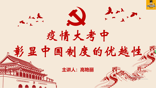 微党课伊始,高艳丽总结了我国在党中央“坚定信心、同舟共济、科学防治、精准施策”总要求的工作部署下,三个多月的抗“疫”历程和持续向好的防控成果。本节微党课主要围绕 “中国速度,到底有多快”“中国力度,到底有多强” “中国温度,到底有多暖”三个部分展开,从党中央动员迅速、指挥得当,到“两山”医院的快速建成,到国家财政补助、保障民生的政策支持,层层剖析,深刻论证了中国制度在疫情大考中能够集中力量办大事的显著优势。高艳丽强调,“疫情防控阻击战凸显了党的领导的重要性,凸显了增强“四个意识”,坚定“四个自信”,做到“两个维护”的重要性。”随后,全体学生党员以“疫情大考中青年党员的使命和担当”为话题,展开深入探讨。石竹君表示,“中国青年在党的领导下,团结一致,共同防疫,充分展现了中国制度的优势,也展现了中国青年党员的担当和奉献。作为一名学生党员,我会向他们学习,争取早日肩负重任,奉献祖国。”微党课最后,高艳丽呼吁青年党员勇敢担负起历史赋予我们的责任和使命,不畏风雨、勇担重任,在党和人民最需要的地方绽放青春。