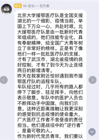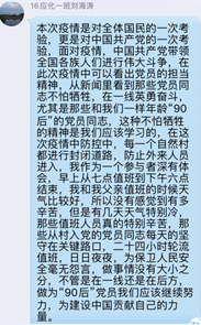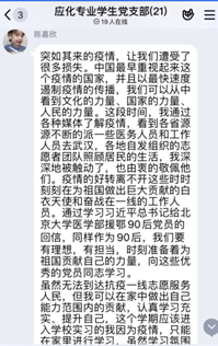 在新冠肺炎疫情防控斗争中,我们身边涌现出无数“战疫”英雄,他们不畏艰险、冲锋在前、舍生忘死,为我们书写了令人感佩的英雄担当。为发扬抗“疫”英雄舍己为人的英雄品质,4月11日,应化专业学生党支部策划了“向战‘疫’英雄看齐”主题党日活动,学生党员通过支部群分享身边的抗“疫”感人事件,共同学习抗“疫”英雄不畏牺牲、甘于奉献的精神品质。