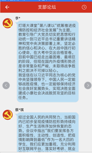 疫情发生以来,为加强支部内的理论学习,应化专业学生党支部开展理论学习每日打卡活动,鼓励党员同志们积极利用“学习强国”、“新闻联播”、“灯塔大课堂”等平台,学习最新的政治理论知识,了解抗“疫”故事,自觉践行“四学”要求,并每天在群内截图打卡,不断加强政治理论知识的学习,提高自身综合素质。