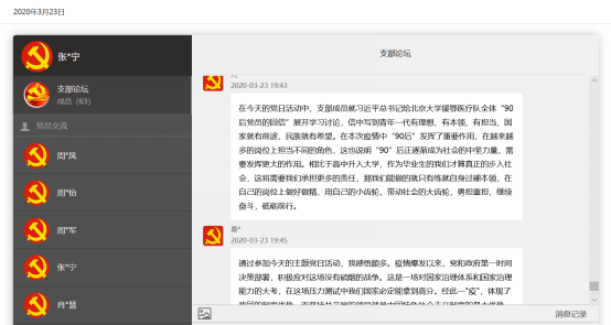 韩哲则以“在隔离在家的时间里,我们也要积极学习,学习党在这次的疫情大考前的方针政策,也要不忘专业课的学习,为自己的未来做好规划,为实现自己的人生价值做好准备,让自己的青春像九零后援鄂医疗队的党员们一样更有意义!”一言号召支部同志不要荒废居家时间,应当一如既往地重视专业课程的学习,同时加强理论知识的学习,以知识武装自己、提升自己。