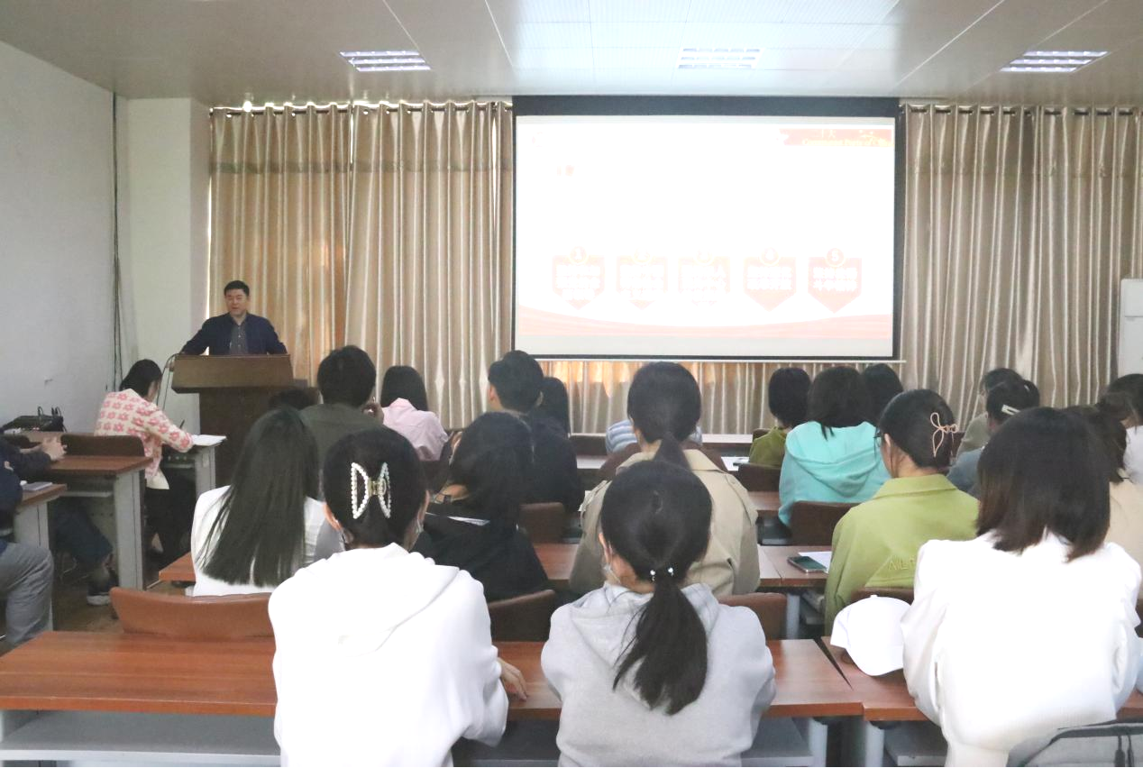 会议伊始,孙南指出党的二十大提出的三个务必:“务必不忘初心、牢记使命,务必谦虚谨慎、艰苦奋斗,务必敢于斗争、善于斗争”是面向全党同志的。接着,通过讲述二十大总结的十年间的三件大事得出了跳出治乱兴衰历史周期率的第二个答案就是自我革命。接着,孙南强调了党的二十大指出中国共产党的中心任务就是团结带领全国各族人民全面建成社会主义现代化强国、实现第二个百年奋斗目标,以中国式现代化全面推进中华民族伟大复兴。以及全党需要把握的五个重大原则是坚持和加强党的全面领导,坚持中国特色社会主义道路,坚持以人民为中心的发展思想,坚持深化改革开放,坚持发扬斗争精神。孙南强调不同的岗位都需要坚持和加强党的领导,要求同学们承担起党员的责任和义务。另外,孙南指出二十大强调了教育、科技、人才是全面建设社会主义现代化国家的基础性、战略性支撑,并向即将踏上教师岗位的同学们提出,要学习知识和技能,全面提升自己,提高专业和实际相结合的能力,培养更多愿意为国家发展做出贡献的优秀接班人。最后,孙南带领同学们从经济实力迅速上升、产业结构明显优化、科技创新跨越发展、全面建成小康社会等方面回顾了十八大以来国家取得的发展成就。