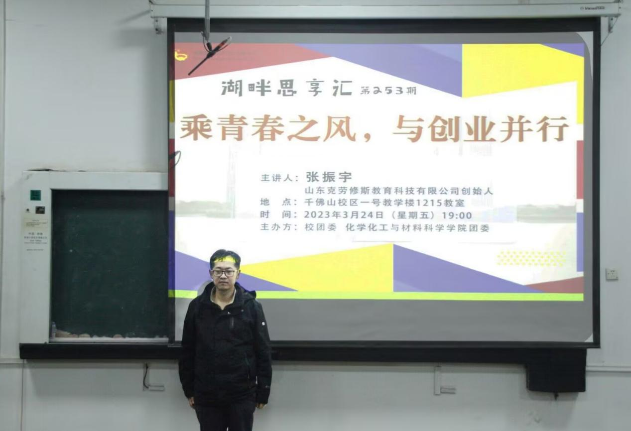 为提升大学生的创新意识,训练创新思维,提高创业能力。3月24日晚,由校团委和学院团委共同主办,院青年发展部承办的湖畔思享汇之“乘青春之风,与创业并行”报告会于千佛山校区一号教学楼1215教室举行。本次报告会邀请山师2013届优秀创业校友、山东克劳修斯教育科技有限公司创始人张振宇作为主讲嘉宾,学院100余名同学积极响应并参与。