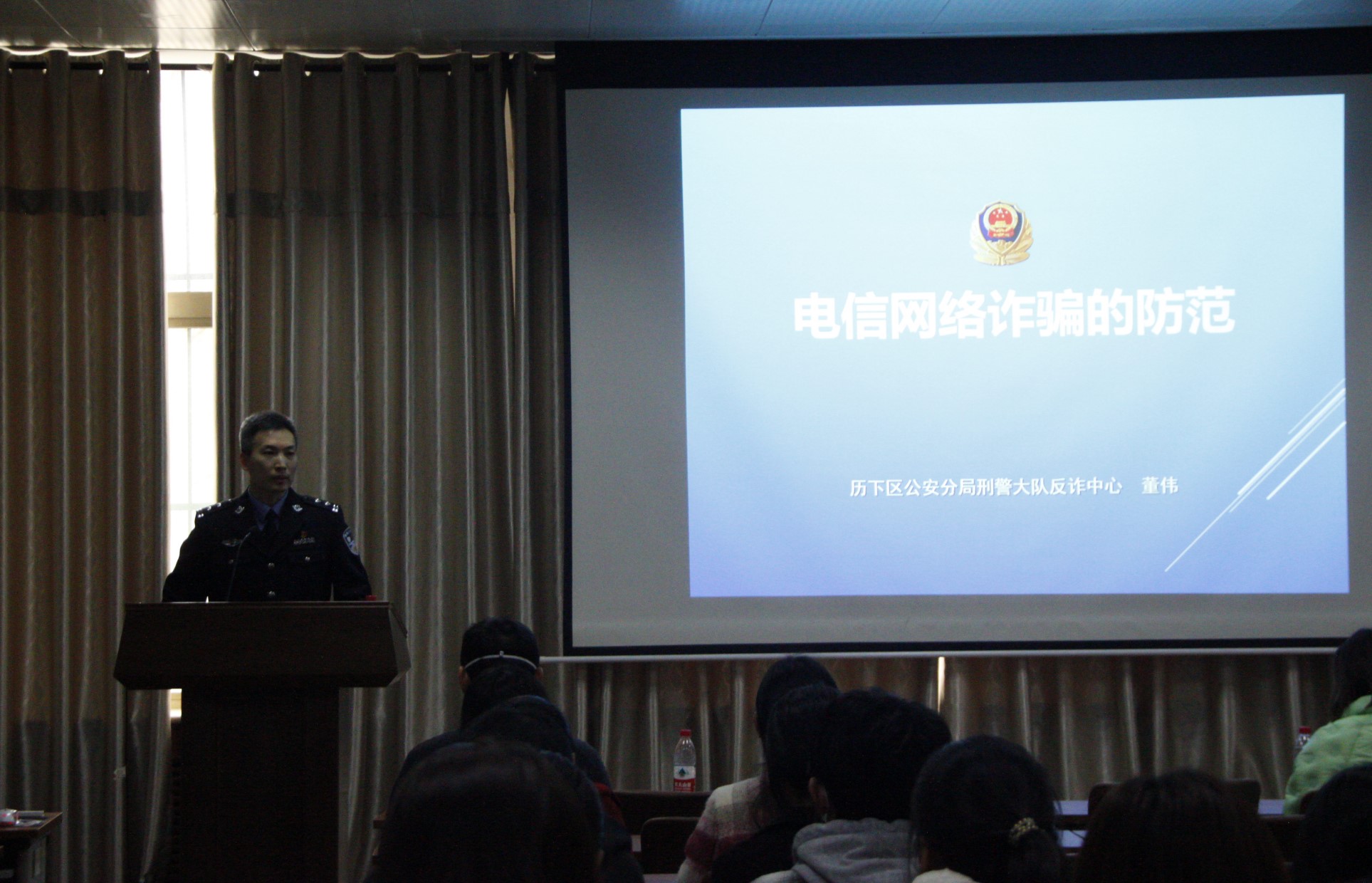 3月16日下午,学院邀请济南市公安局历下分局刑警大队反诈中队中队长董伟警官,为学院学生做防范电信网络诈骗专题讲座。学院党委副书记孙南出席活动。讲座由2019级辅导员孙朝阳主持。