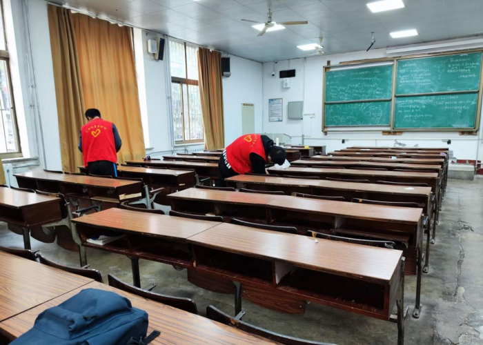 本次“5+”活动,志愿者的身影活跃在校园、餐厅、宿舍、教室的每个角落,疫情态势严峻,志愿者们助力抗疫、共克时艰。在“美化校园”行动中,志愿者们在教学楼周围捡拾垃圾、擦拭长椅、清扫落叶,营造美丽校园环境;,在“明亮教室”行动,志愿者们彻底打扫教室卫生,放置收纳盒收纳粉笔与板擦,为恢复线下课准备良好的学习环境;在“文明餐厅”活动中,志愿者在每个餐厅进出口,提醒同学们有序排队、戴好口罩、扫描场所码测温进入,为疫情防控贡献一份力量,并且开展“送口罩”暖心活动,给食堂工作人员送去医用口罩,向他们坚持工作表达感谢,并提醒他们注意防疫;同时,志愿者在宿舍宣讲“文雅宿舍”,张贴标语、随手关灯,提醒同学们注意宿舍卫生、公共区域卫生,共筑美好宿舍文化。