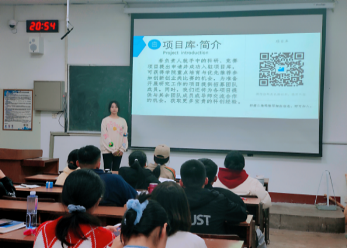 宣讲伊始,志愿者为同学们介绍了青椒计划“chem科技创新资源对接平台”的相关信息。而后详细地阐述了平台设有的三个部分:人才库、项目库、导师库。人才库通过学生自愿报名参与,学院通过笔试面试等形式选拔出优秀的学生加入到人才库,作为学院双创储备人才;导师库依托化学院青年骨干教师建立,导师们为优秀本科生提供科研机会,帮助本科生提高科研创新意识,增强科研创新能力,并通过平台积极推动科研成果转化,指导学生参与创新创业实践。项目库通过向全院师生征集创新创业项目入驻项目库,平台为项目提供培育机会,并选拔优秀项目推荐参加创新创类比赛。
