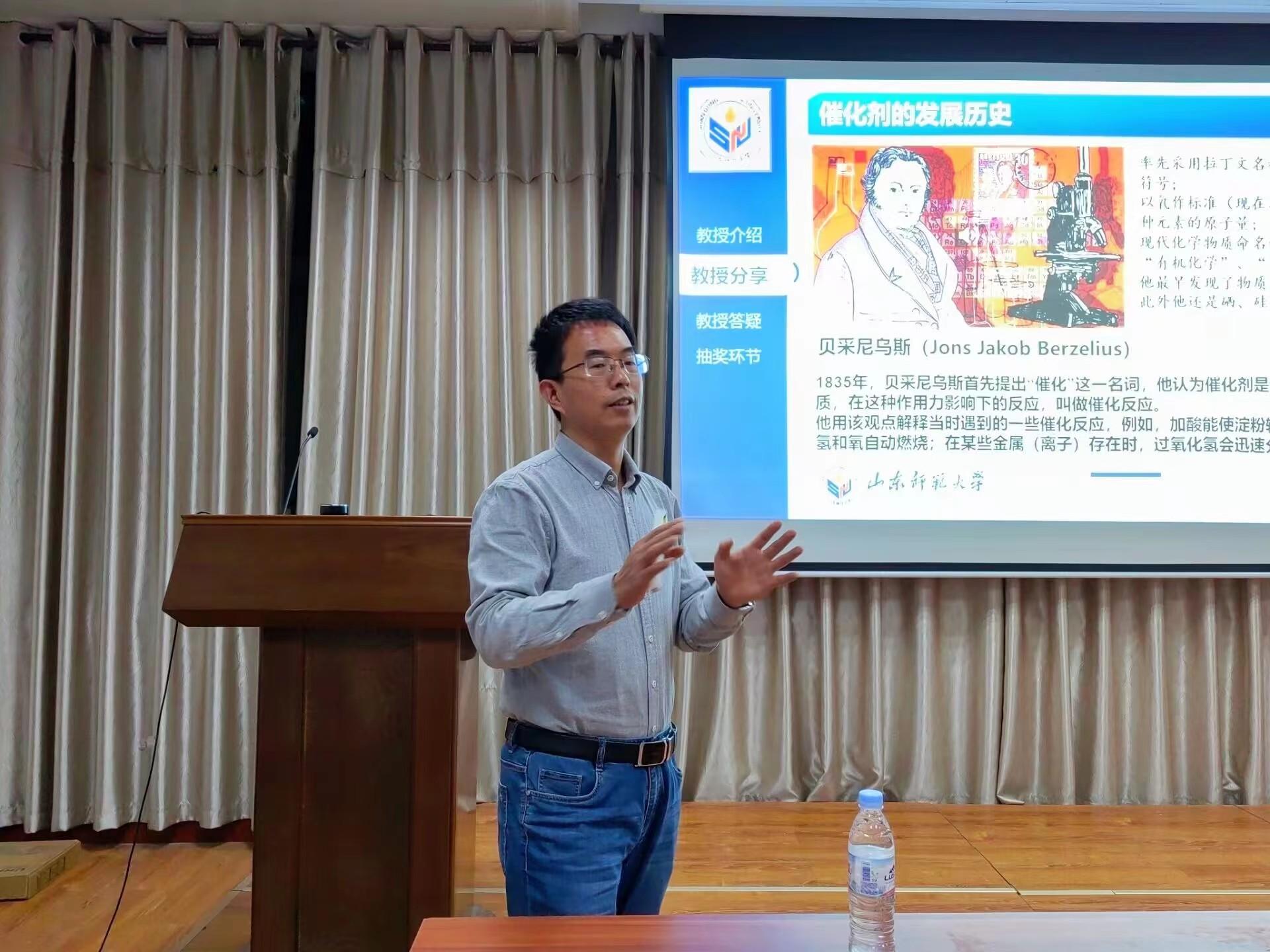活动伊始,陈功军教授先介绍了他的科研经历以及现在所从事的科研方向:多孔材料包括金属—有机框架,共价有机骨架材料的合成,及其催化性质方面的研究。紧接着陈教授用浅显有趣的方式介绍了催化剂,从催化剂的发展探索历史到催化剂的催化原理和现在科学家们关心的催化反应,陈教授幽默风趣的介绍使同学们明白科学就是在运气和努力的包围下孕育出的结晶,明晰了努力学习探索的方向。而后陈教授解答了同学们在化学学习中遇到的问题,他提出化学人靠的就是一次次的尝试和失败,学好化学就要不怕失败,直面失败。他激励同学们不畏眼前的困难,直面挑战。最后在掌声中活动圆满落下了帷幕。