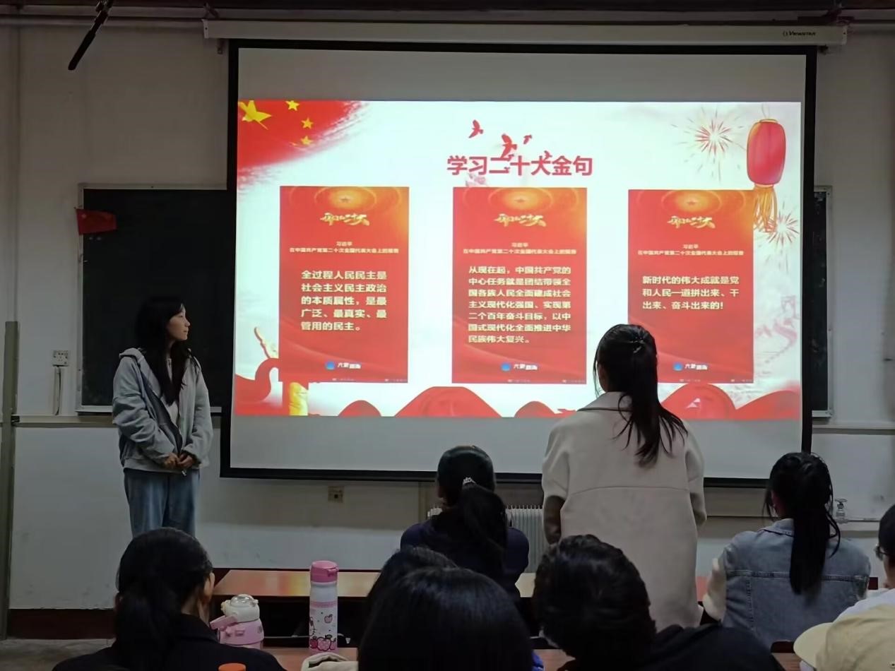 本次活动分为三大板块,各个板块以团支部为单位开展。第一,各班班长支书号召班内同学学习党的二十大精神,通过观看党的二十大会议,了解代表选举以及党的二十大召开机制,深入了解全国代表大会进程,聚焦国家热点问题,分析国际国内形势,全面把握新时代新征程党和国家发展新要求,深刻领会习近平总书记重要讲话并做好记录。党的二十大报告指出,责任无比重大,使命无上光荣,唯有不忘初心,牢记使命,谦虚谨慎,艰苦奋斗,敢于斗争,善于斗争,坚定历史自信、增强历史主动,方能谱写新时代中国特色社会主义更加绚丽的华章。第二,各班组织班级特色团辅活动。通过特色活动,加强了班级凝聚力,增强了班级荣誉感,也使班级成员加深对彼此的了解,以更饱满的精神状态投入到工作和学习中。第三,根据党的二十大报告精神,各班开展党的二十大主题班会,团支书带领班内同学回顾党的重大会议和艰辛历程,从过去各项决策中吸取教训,从当下重大成就中借鉴经验。班会上各班班委起带头作用,贯彻落实党的二十大精神,领导组织班级工作,鼓励同学们自信自强、挥斥方遒,守正创新、勇毅前行,怀抱梦想又脚踏实地、敢想敢为又善作善成,立志做有理想、敢担当、能吃苦、肯奋斗的新时代好青年。