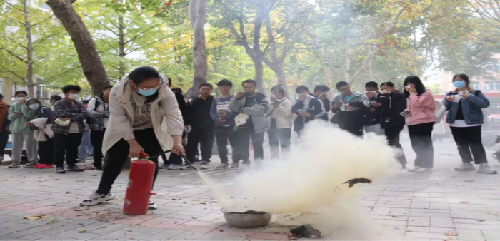 为响应学院“安全月”活动的号召,增强学院师生的安全意识,提高学生的安全自救能力,10月26日中午,学院于千佛山校区化学科研楼举办新生消防演习。本次活动由学院团委主办,学院2022级辅导员高艳丽老师莅临现场指导。学院新生及其他年级代表参加演练。