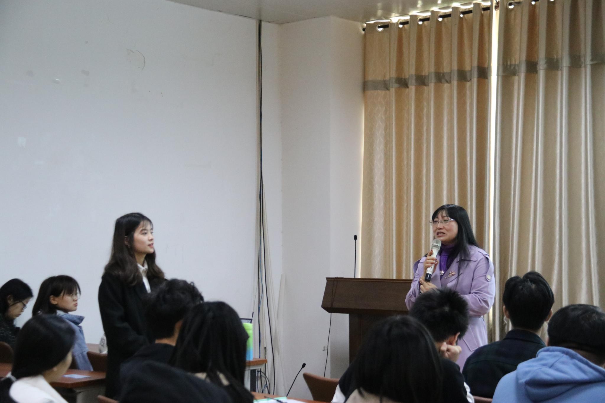 活动在轻松愉快的氛围中开始,贾梦英老师首先给同学们讲述了自己丰富的学习经历和深刻感受。紧接着,贾梦英老师就“研商”与“情商”的关系展开了今日的分享交流会。老师首先为同学们讲解了“三大领域,六种素养,十八个指标”的相关知识,指出作为化学人应该具备的核心素养,即要具有“理性思维、批判质疑、勇于探索”的科学精神,学会学习,要知道为什么学化学、什么是化学、化学有什么特征和性质,只有了解学习化学的目标的基础上再坚持实践创新才能学会化学、学懂化学,从化学学习中发现化学的美。专业而又有趣的讲解过后,讲座进入现场提问环节。到场同学们热情高涨,向老师提出关于化学教学等各方面问题,贾梦英老师耐心倾听,传道授业,热情地解答了同学们的迷茫和困惑,获得现场观众掌声连连,将现场氛围推向高潮。最后,贾梦英老师以“终日乾坤,与时偕行”赠予同学们,希望同学们能够坚定求学信念,不负青春韶华。至此,本次讲座圆满落幕。