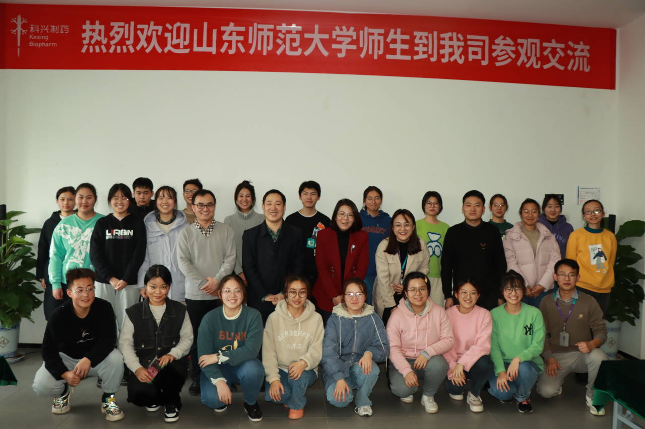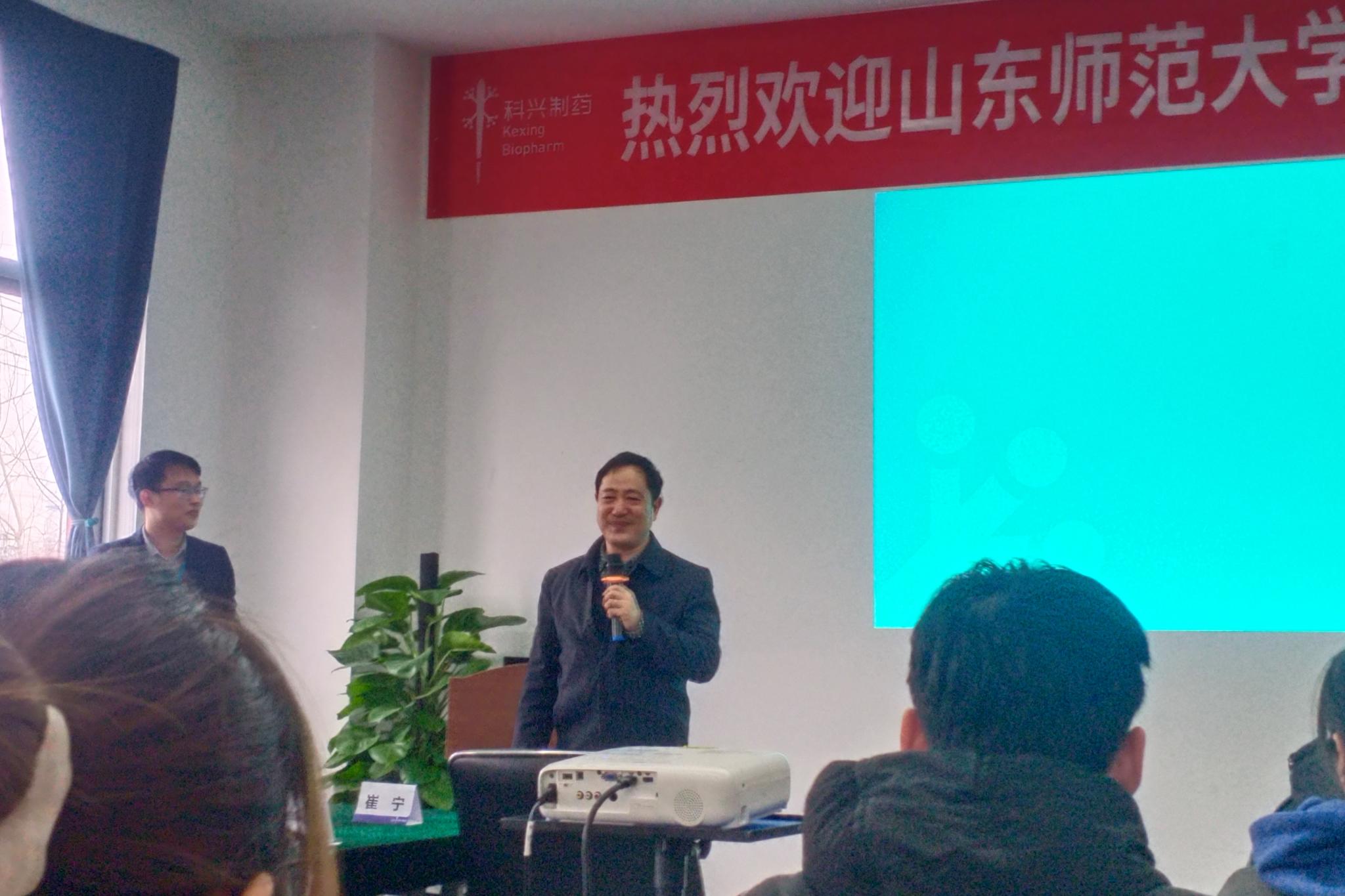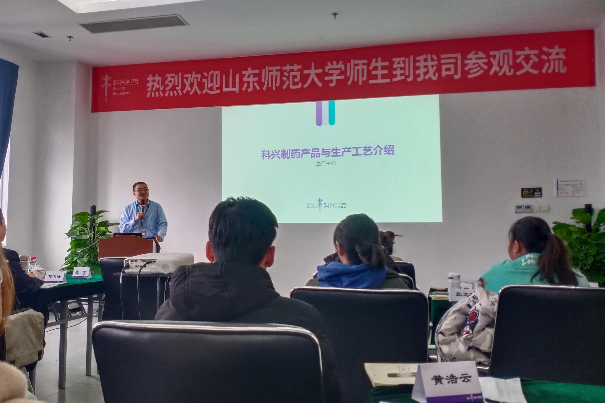 欢迎仪式结束后,王晓鑫就公司概况、产品与市场、研发与创新、公司战略四个方面,向老师以及同学们进行了详细全面的介绍,加深了同学们对公司的认识,完整的产业链让大家看到了未来就业的无限可能;崔兆臣对科兴制药产品与生产工艺进行介绍,着重介绍了“依普定”、“白特喜”、“常乐康”药品的说明以及相应的合成过程,拓展了同学们的知识层面,开拓眼界,感受独特的企业魅力。
