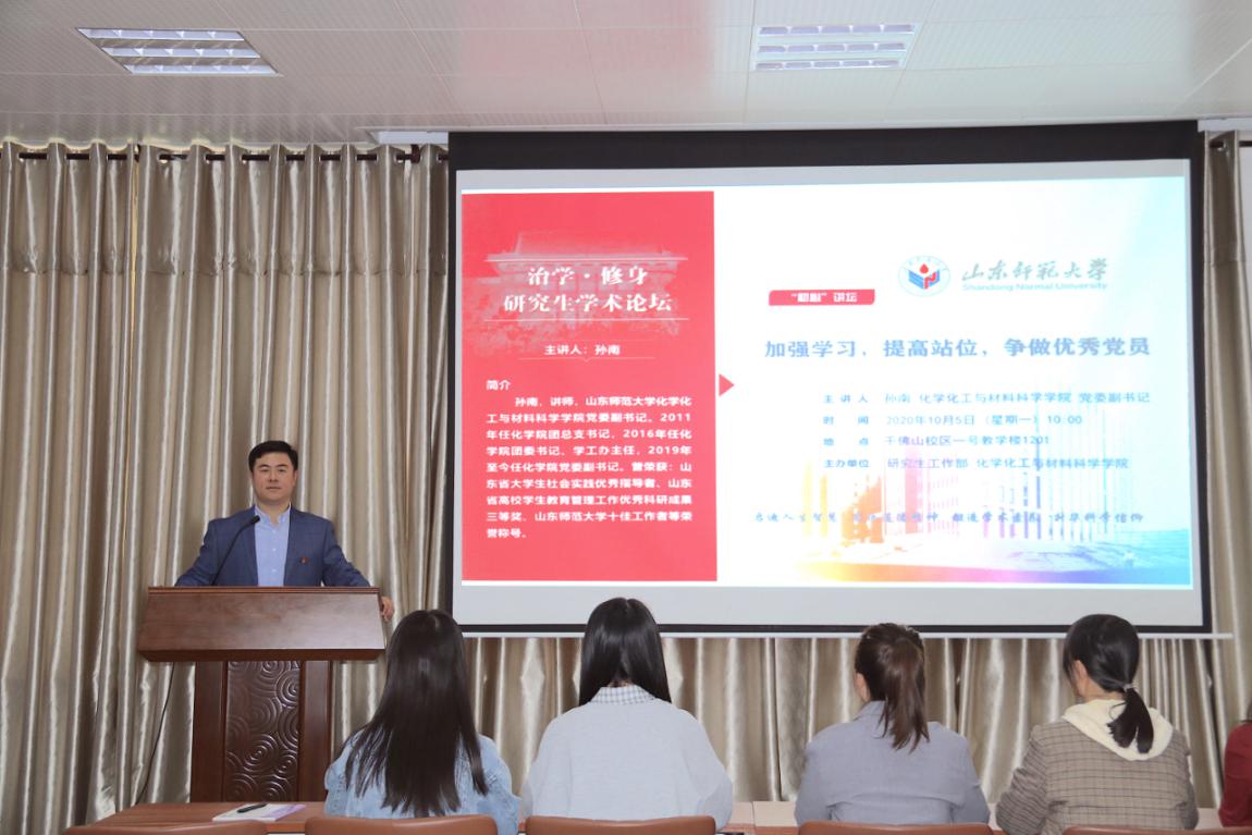 10月5日上午,由校党委研究生工作部主办,英国365上市公司承办的“治学•修身”研究生学术论坛在千佛山校区1201报告厅成功举行。本次论坛邀请了学院党委副书记孙南作了题为“加强学习,提高站位,争做优秀党员”的讲座,本次“初心”讲坛旨在加强研究生党员思想引领、提升广大研究生党性修养。讲坛由研究生辅导员马巾晴主持,化学院近百名研究生党员参与聆听。